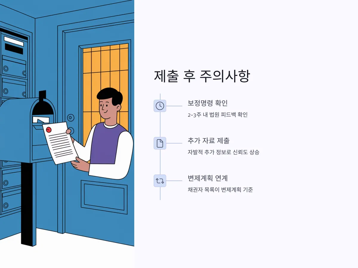 채권자 목록을 제출했다고 끝난 것이 아닙니다. 법원은 통상 2~3주 내에 보정명령을 발송하며, 이때 누락된 정보나 잘못된 부분이 있다면 수정 후 다시 제출해야 합니다.