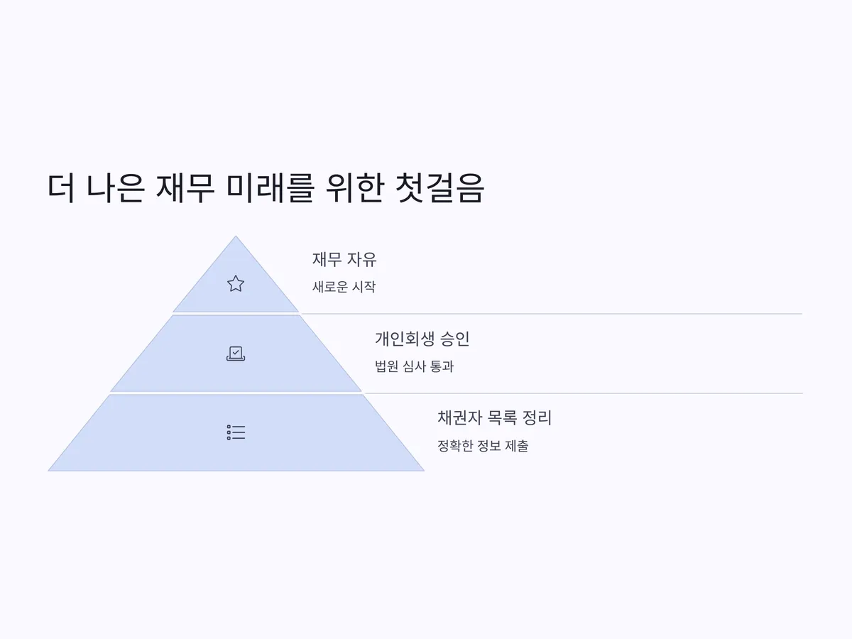 또한, 변제계획안을 작성할 때 기준이 되는 것이 바로 이 채권자 목록이기 때문에, 한 번 정리가 잘 되어 있으면 이후의 모든 절차가 수월해집니다.