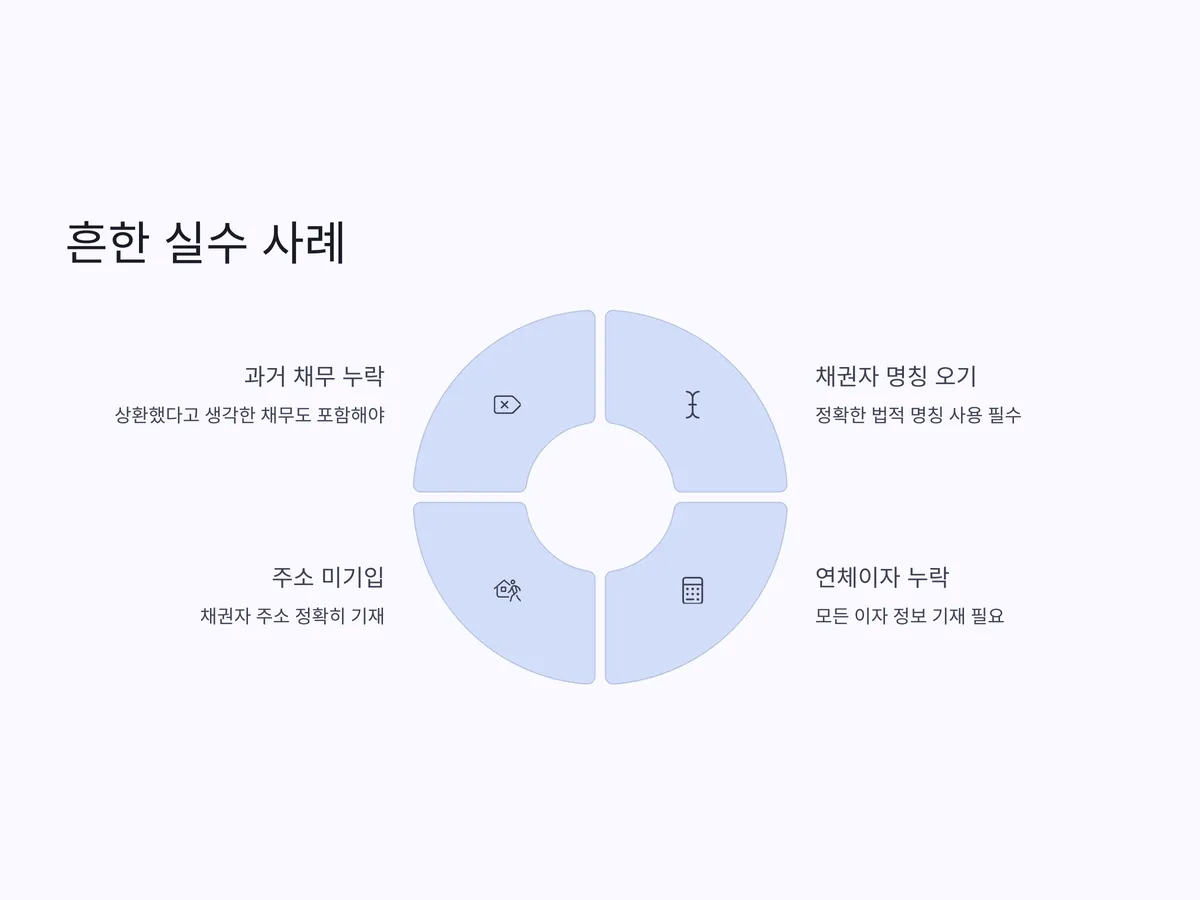 또한, ‘채권자 명칭 오기’도 매우 잦은 실수입니다. ‘국민은행’이라고만 기입하면 되지 않고, ‘KB국민은행’처럼 정확한 명칭을 사용해야 합니다. 일부 금융기관은 ‘현대캐피탈’과 ‘현대카드’처럼 유사하지만 법적으로 다른 채권자이므로 반드시 구분하여 작성해야 합니다.