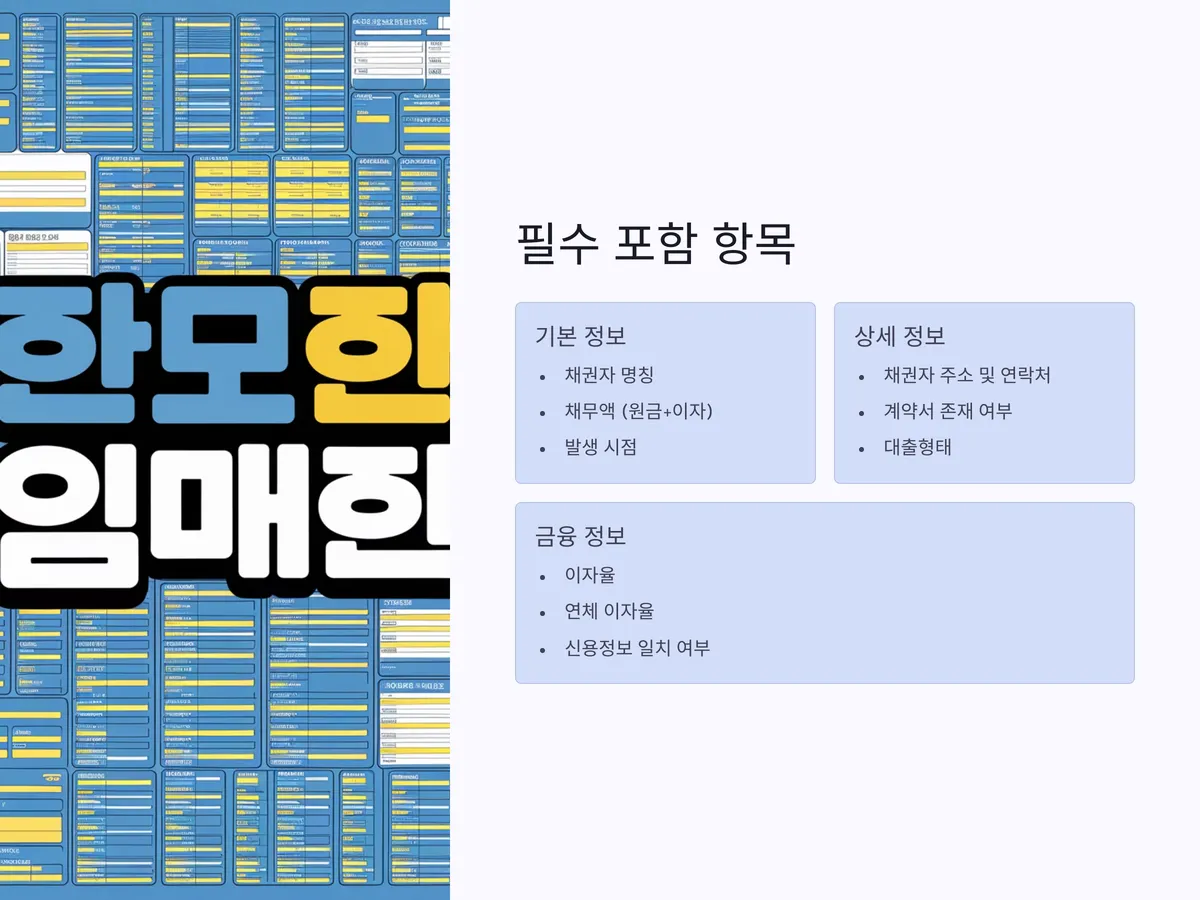 채권자 목록 작성 시 기본적으로 포함해야 할 항목은 다음과 같습니다.
