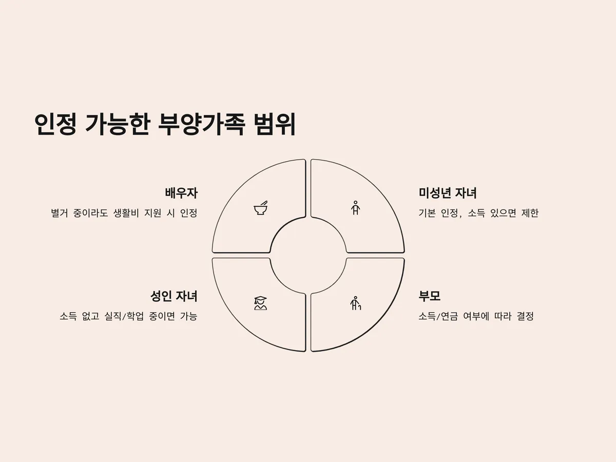 - 배우자: 별거 중이라도 실질적 생활비를 지원하고 있다면 인정 가능