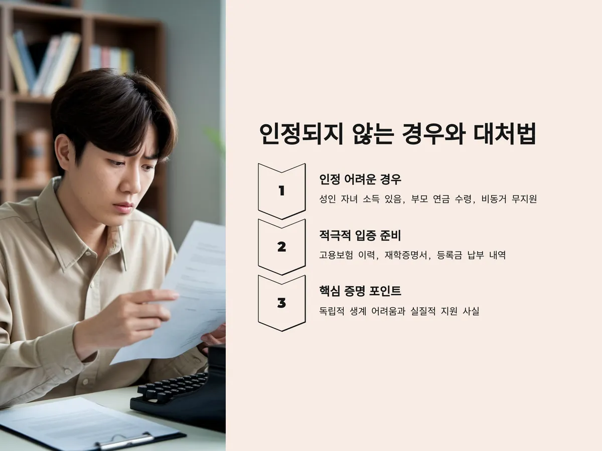 이럴 경우에는 적극적인 입증자료 준비가 필요합니다. 예를 들어, 성인 자녀가 실직상태라면 고용보험 피보험자 이력내역서를 제출하거나, 학업 중인 경우에는 재학증명서와 등록금 납부 내역 등을 추가로 제출해야 합니다. 중요한 것은 ‘왜 이 가족이 독립적인 생계가 어렵고 내가 실질적으로 지원하고 있는지’를 증명하는 것입니다.
