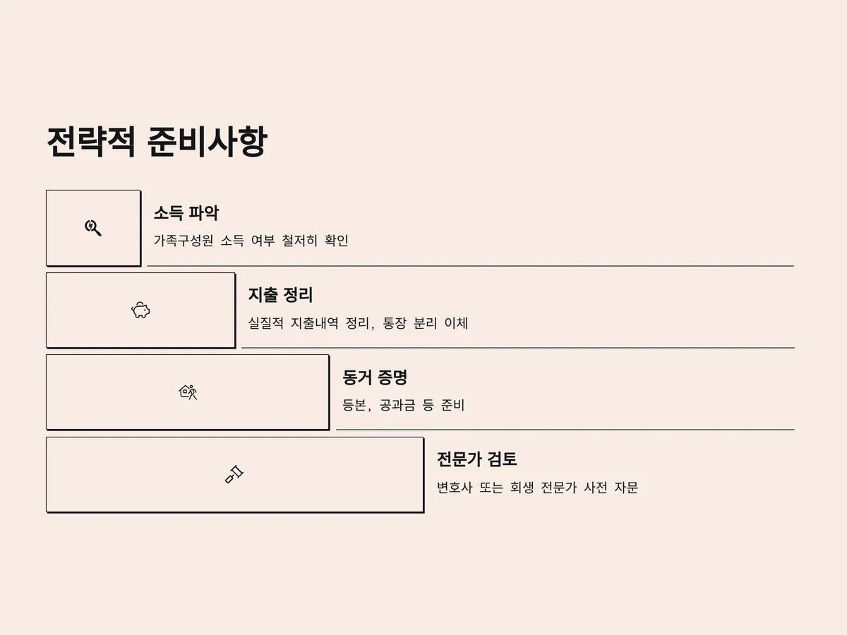 부양가족 인정은 전략적 접근이 필요합니다. 단순히 인원수를 채우는 것이 아니라, 인정 가능성이 높은 가족을 중심으로 자료를 준비하고, 사전 자문을 받는 것이 중요합니다. 다음과 같은 전략을 권장합니다: