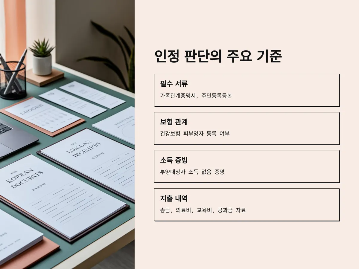 단순히 가족관계증명서만 제출해서는 부족하며, 의료비·교육비·공과금 등의 명세서와 송금 내역, 주민등록등본 상의 동거 여부 등이 함께 필요합니다.