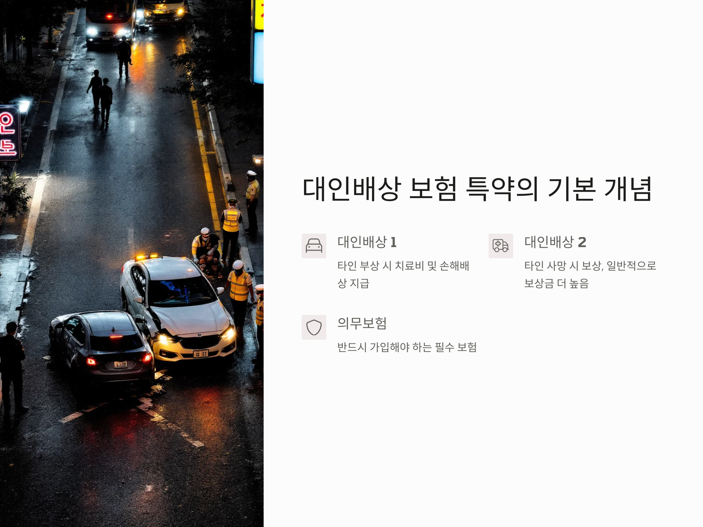 대인배상 보험 특약은 사고 발생 시 타인에게 발생한 신체적 피해나 사망에 대해 보상하는 보험입니다. 이 특약은 주로 자동차 보험에 포함되며, 다른 사람을 다치게 하거나 사망에 이르게 한 경우에 보험회사가 일정한 금액을 지급하여 사고 발생자의 경제적 부담을 덜어주는 역할을 합니다. 대인배상은 크게 두 가지로 나누어지며, 각각 대인배상 1과 대인배상 2로 구분됩니다.