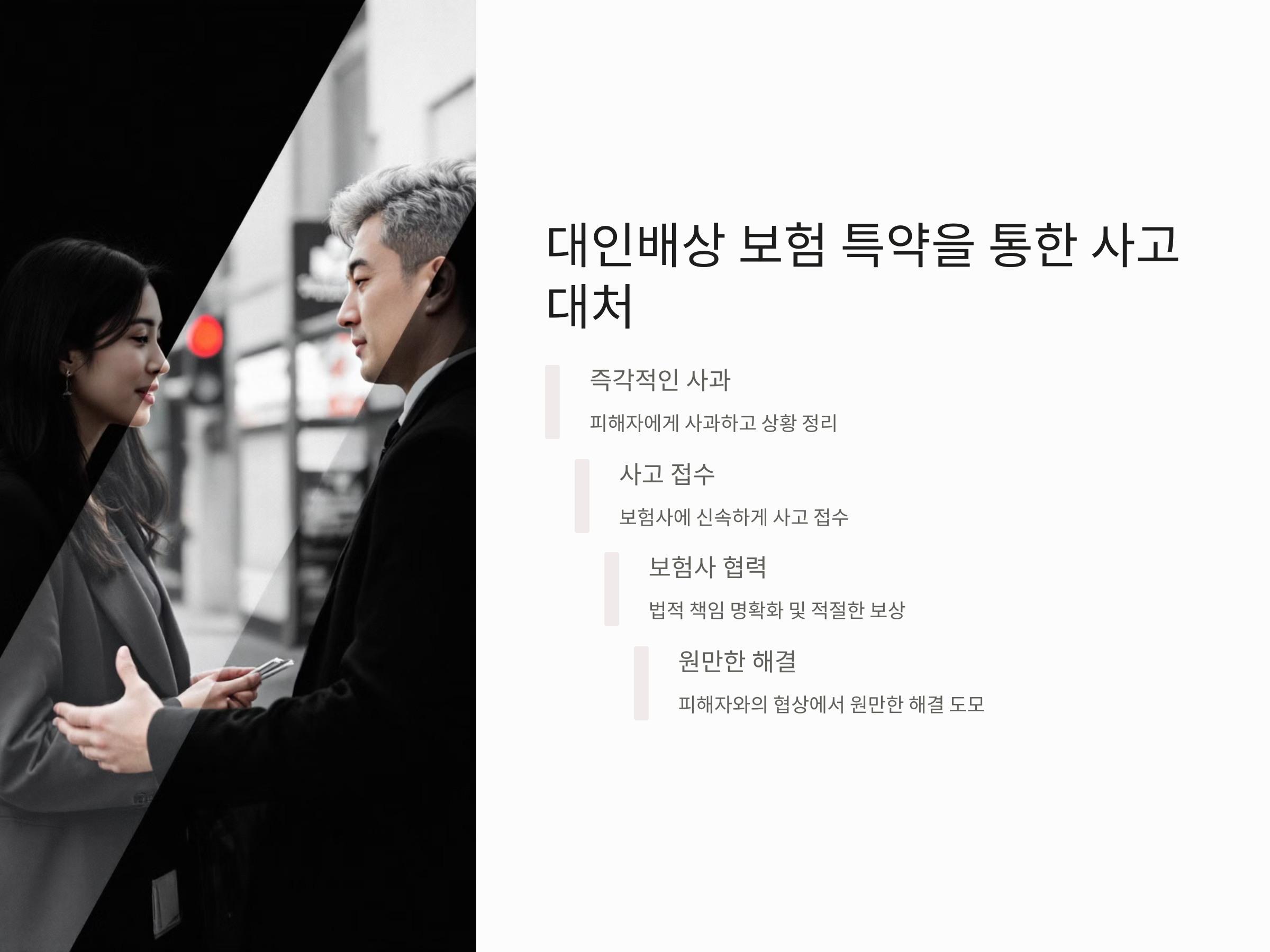 사고가 발생했을 때, 가능한 한 피해자와의 협상에서 원만한 해결을 도모하는 것이 중요합니다. 또한, 대인배상 보험 특약이 적용되기 위해서는 보험 가입 시 계약서에 명시된 조건을 철저히 준수해야 합니다.