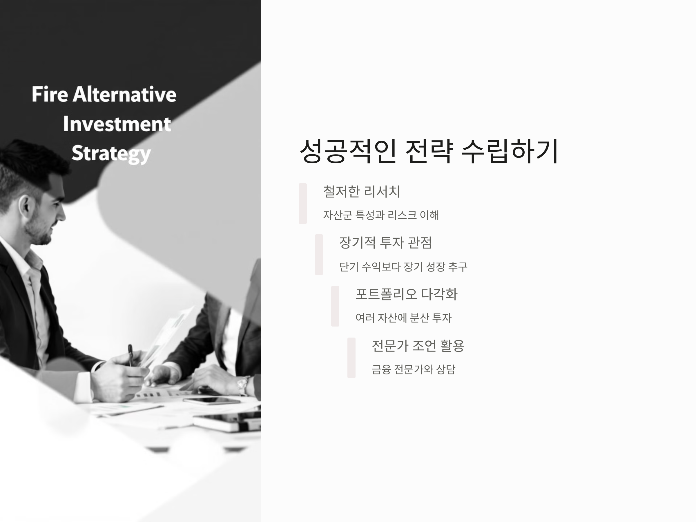 대체투자에서 성공적인 전략을 수립하려면, 다음과 같은 몇 가지 중요한 요소를 고려해야 합니다.