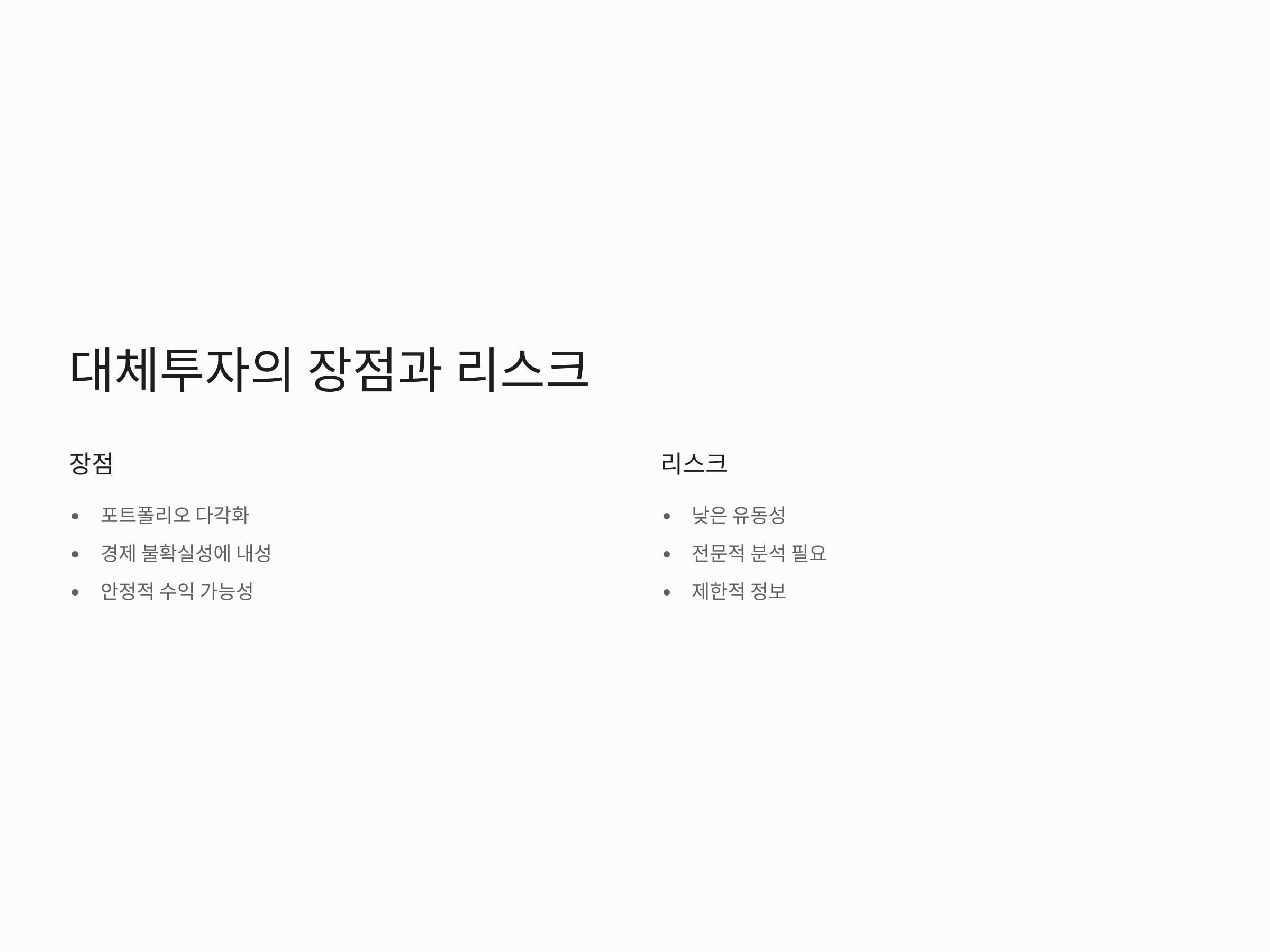 하지만 대체투자는 그만큼 리스크가 크기도 합니다. 특히 유동성이 낮은 자산이 많아 자금을 회수하는 데 시간이 걸릴 수 있으며, 일부 자산군은 고도의 전문적인 분석을 요구합니다. 또한, 대체투자는 전통적인 금융 자산군과 비교해 정보가 제한적일 수 있어, 투자에 대한 정확한 평가가 어려운 경우가 많습니다. 이러한 리스크를 충분히 이해하고 투자 결정을 내려야 합니다.