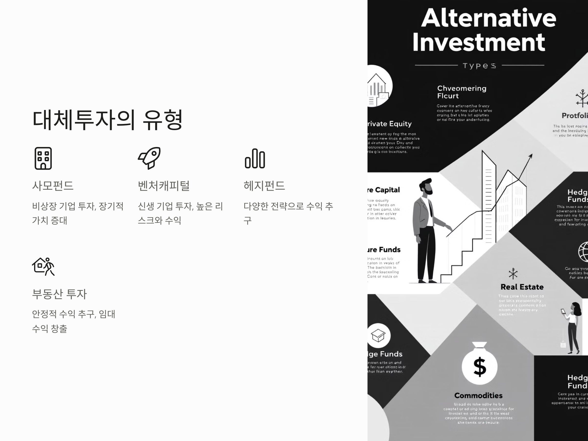- 부동산 투자 (Real Estate Investment): 부동산 투자는 안정적인 수익을 추구하는 투자자들에게 적합한 대체투자입니다. 상업용 부동산, 주거용 부동산 등 다양한 부동산 자산에 투자하여 임대 수익 또는 자산가치 상승을 노립니다.