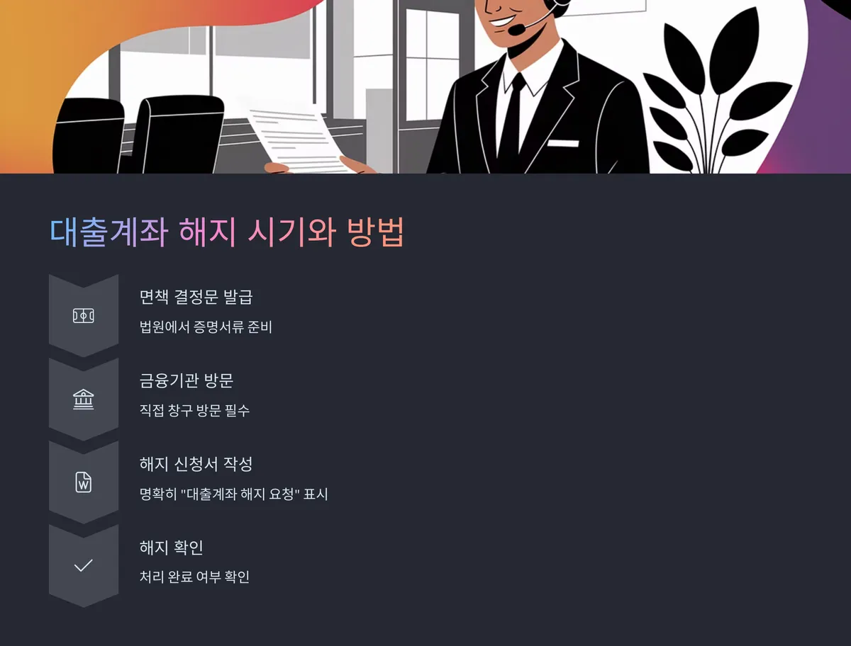 개인회생 종결이 확정된 이후 즉시 해지 절차를 밟는 것이 가장 좋습니다. 먼저 법원에서 '면책 결정문' 또는 '변제 완료확인서'를 발급받고, 해당 대출을 제공한 금융기관에 이를 지참해 해지를 요청하면 됩니다. 간단한 신청서만 작성하면 보통은 당일 처리됩니다. 중요한 것은 직접 해당 창구에 방문하거나, 공인인증 기반의 비대면 신청을 통해 명확하게 "대출계좌 해지 요청"임을 밝혀야 한다는 점입니다.