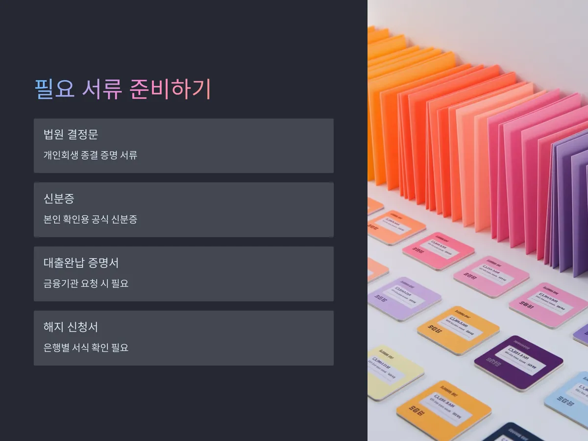 대출계좌를 해지하기 위해 기본적으로 준비해야 할 서류는 다음과 같습니다. 첫째, 개인회생 종결에 대한 법원의 결정문. 둘째, 본인 신분증. 셋째, 경우에 따라 금융기관의 요청에 따라 ‘대출완납 증명서’가 필요할 수 있습니다. 간혹 은행에 따라 서식이 따로 있는 경우도 있으니 사전 문의는 필수입니다.