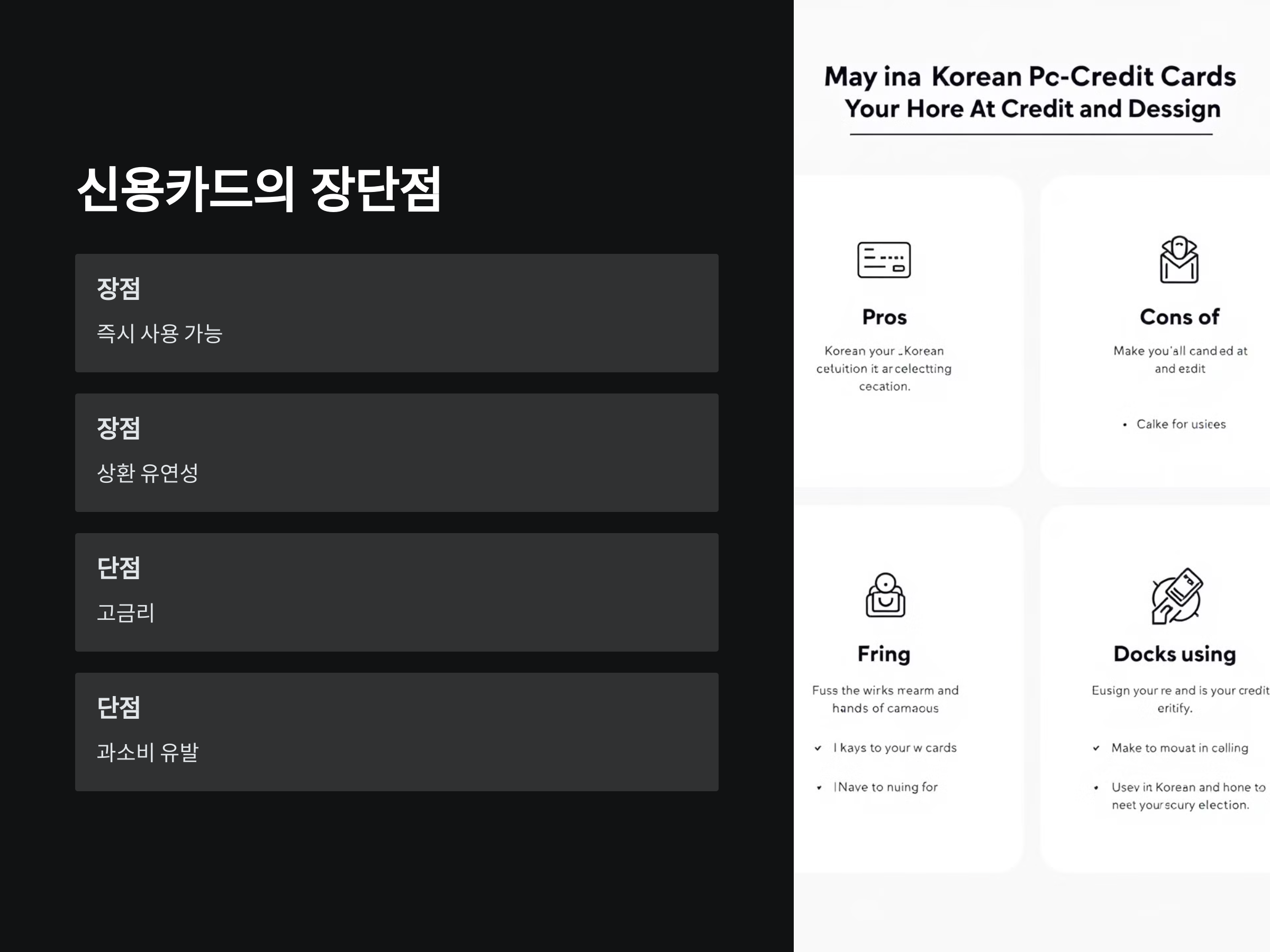 - 고금리: 신용카드는 대출에 비해 금리가 높은 경우가 많고, 미납 시 높은 이자가 부과될 수 있습니다.
