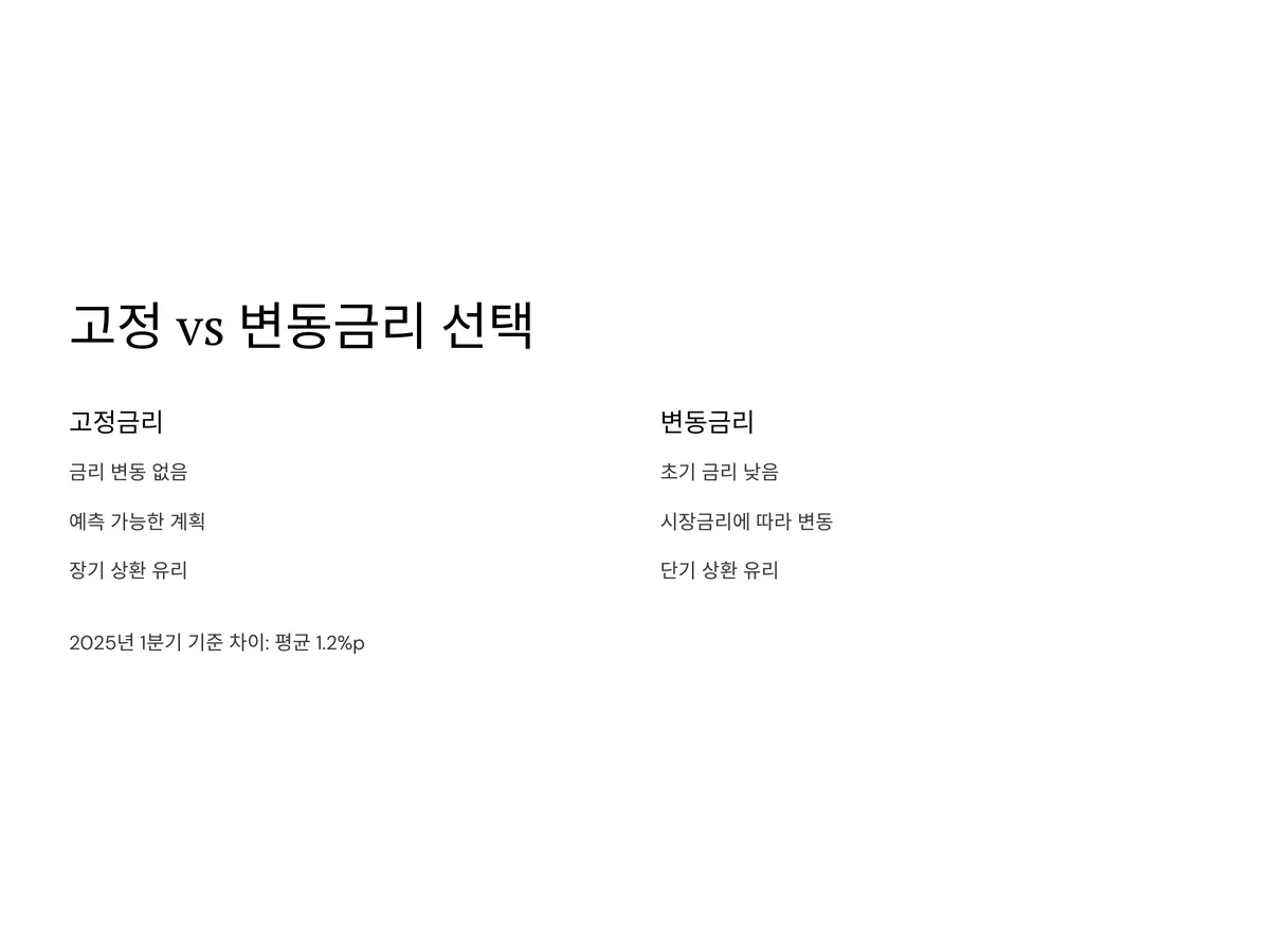 2025년 1분기 기준, 고정금리와 변동금리의 차이는 평균 1.2%p 수준이며, 한국은행 기준금리 변동에 따라 이 격차는 더 벌어질 가능성이 큽니다. 대출금 상환 계획이 5년 이상이라면 고정금리가 유리할 수 있고, 반대로 1~2년 이내 상환 예정이라면 변동금리의 이점을 누릴 수도 있습니다.