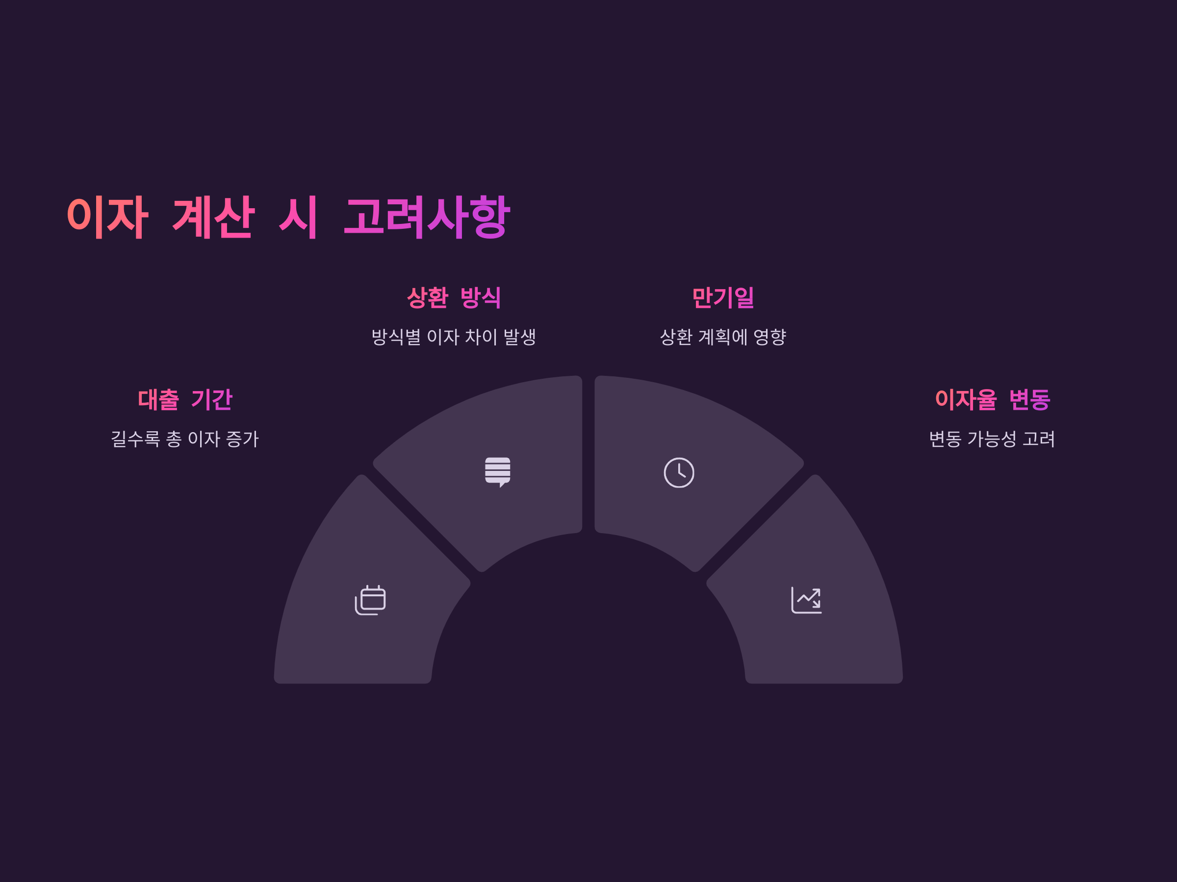 대출 이자를 계산할 때는 단순히 이자율과 원금만 고려하는 것이 아닙니다. 여러 가지 변수들이 상환 금액에 영향을 미칩니다. 예를 들어, 대출의 상환 방식에 따라 매달 상환해야 하는 금액이 달라지기 때문에, 이를 고려한 정확한 계산이 필요합니다. 또한 대출의 만기일, 이자율 변동 가능성, 그리고 연체에 따른 추가 이자 등을 포함한 다양한 요소들이 대출 이자에 영향을 미칠 수 있습니다.