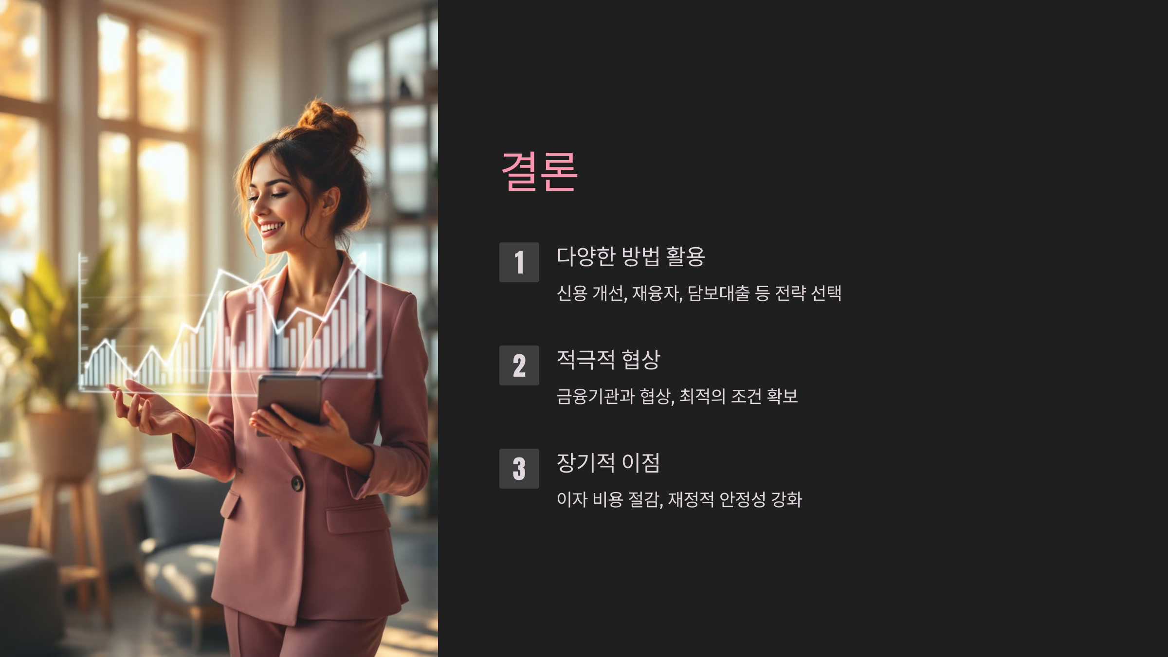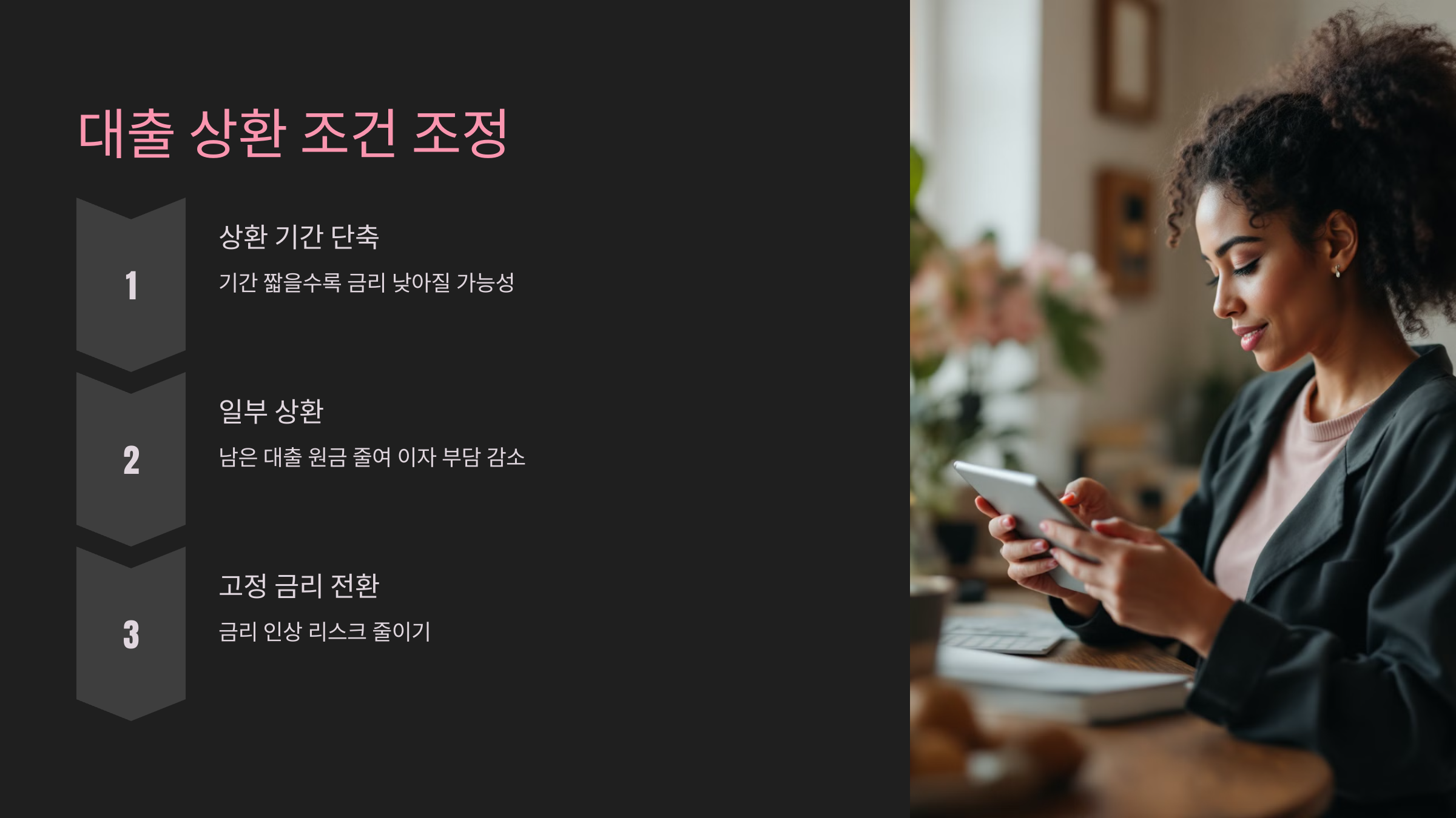 대출 상환 조건을 재조정하는 방법은 단기적으로 이자 부담을 줄이는 데 도움이 될 수 있으며, 이를 통해 금리 혜택을 얻을 수 있습니다.