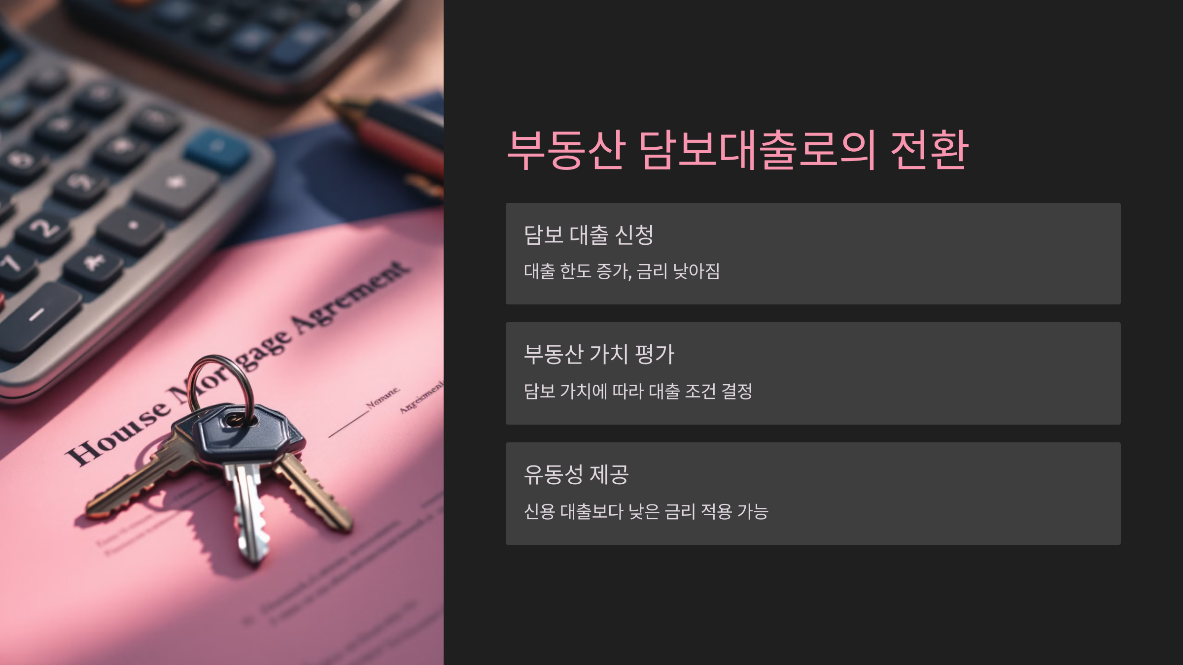 - 담보 대출 신청: 담보 대출은 대출 가능 한도가 커지고 금리가 낮아지므로, 기존 신용 대출보다 경제적으로 유리할 수 있습니다.