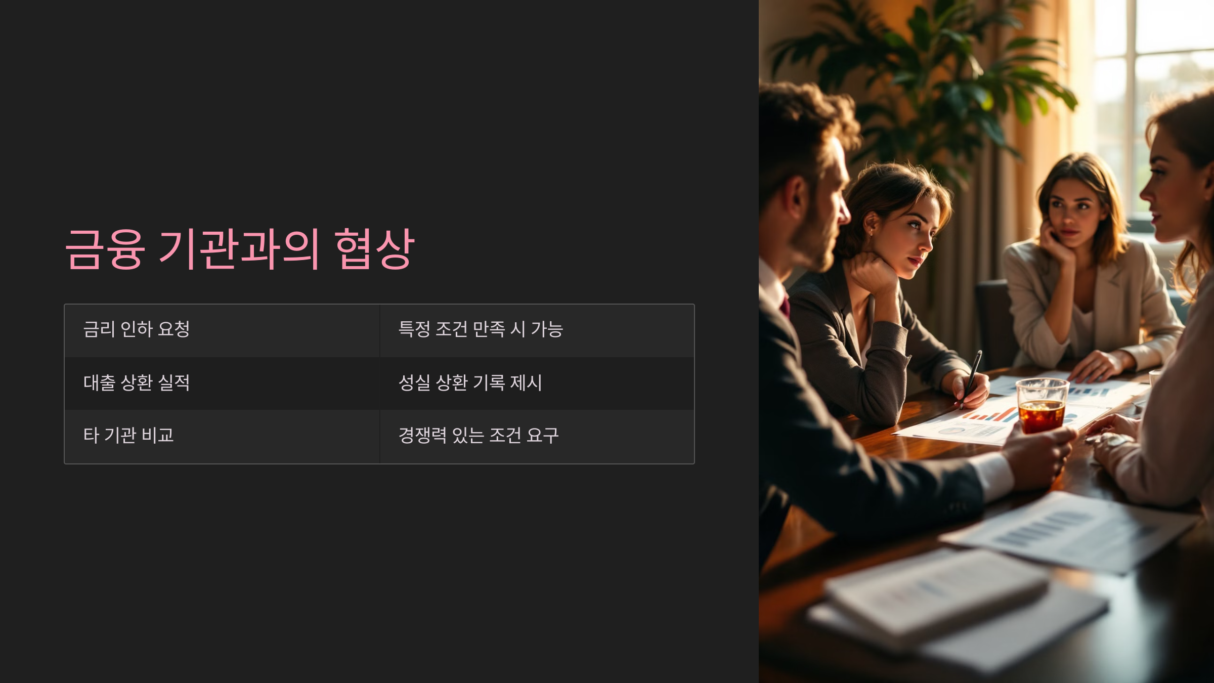 금융기관과의 협상은 적극적으로 금리 인하를 시도하는 전략이 될 수 있으며, 금융기관의 정책에 따라 유동적으로 금리 인하가 가능합니다.