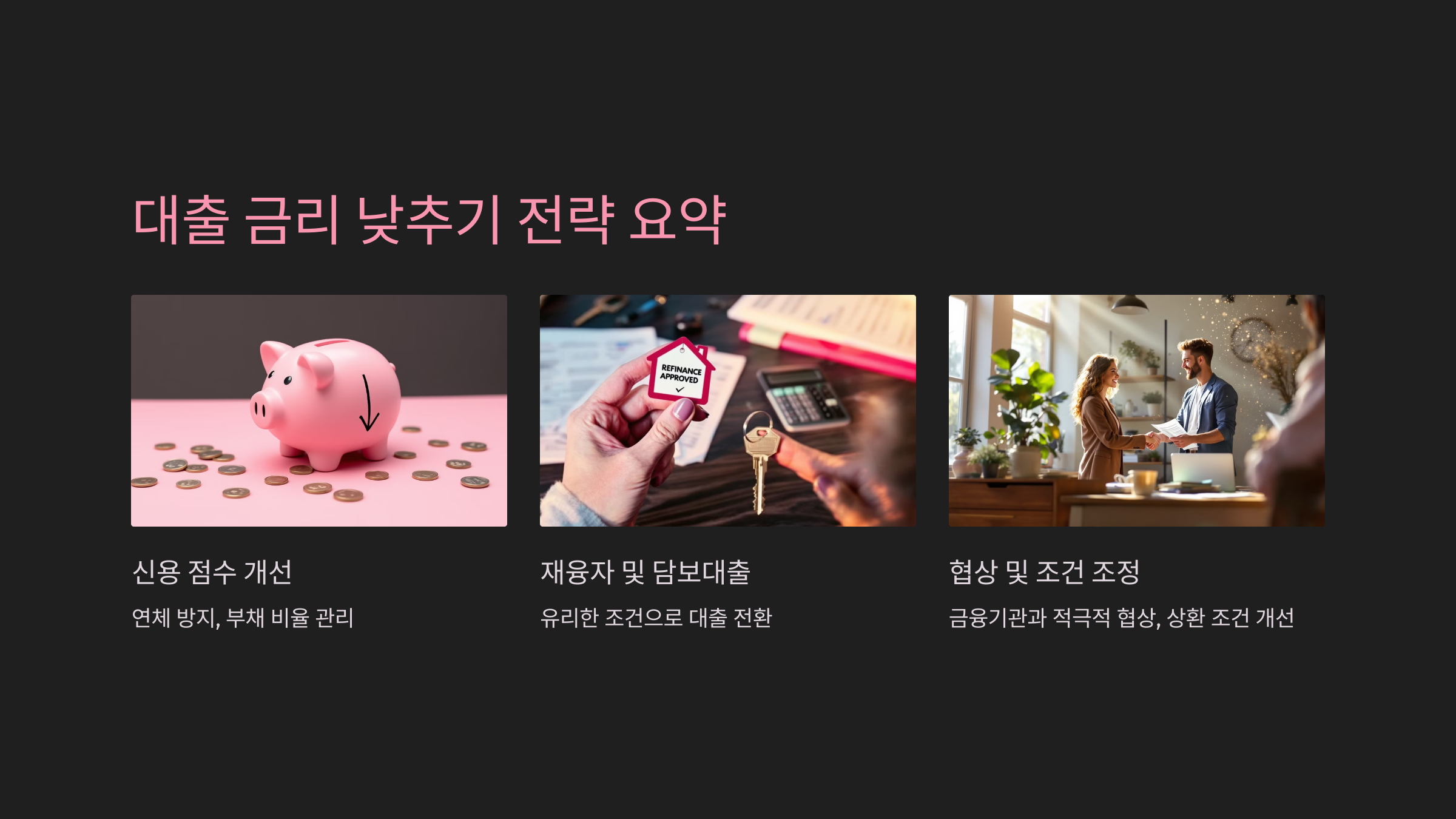 담보 대출을 고려할 때는 담보 자산의 가치가 충분히 인정되는지를 확인하고, 이를 통해 금리 인하의 혜택을 받을 수 있도록 해야 합니다.