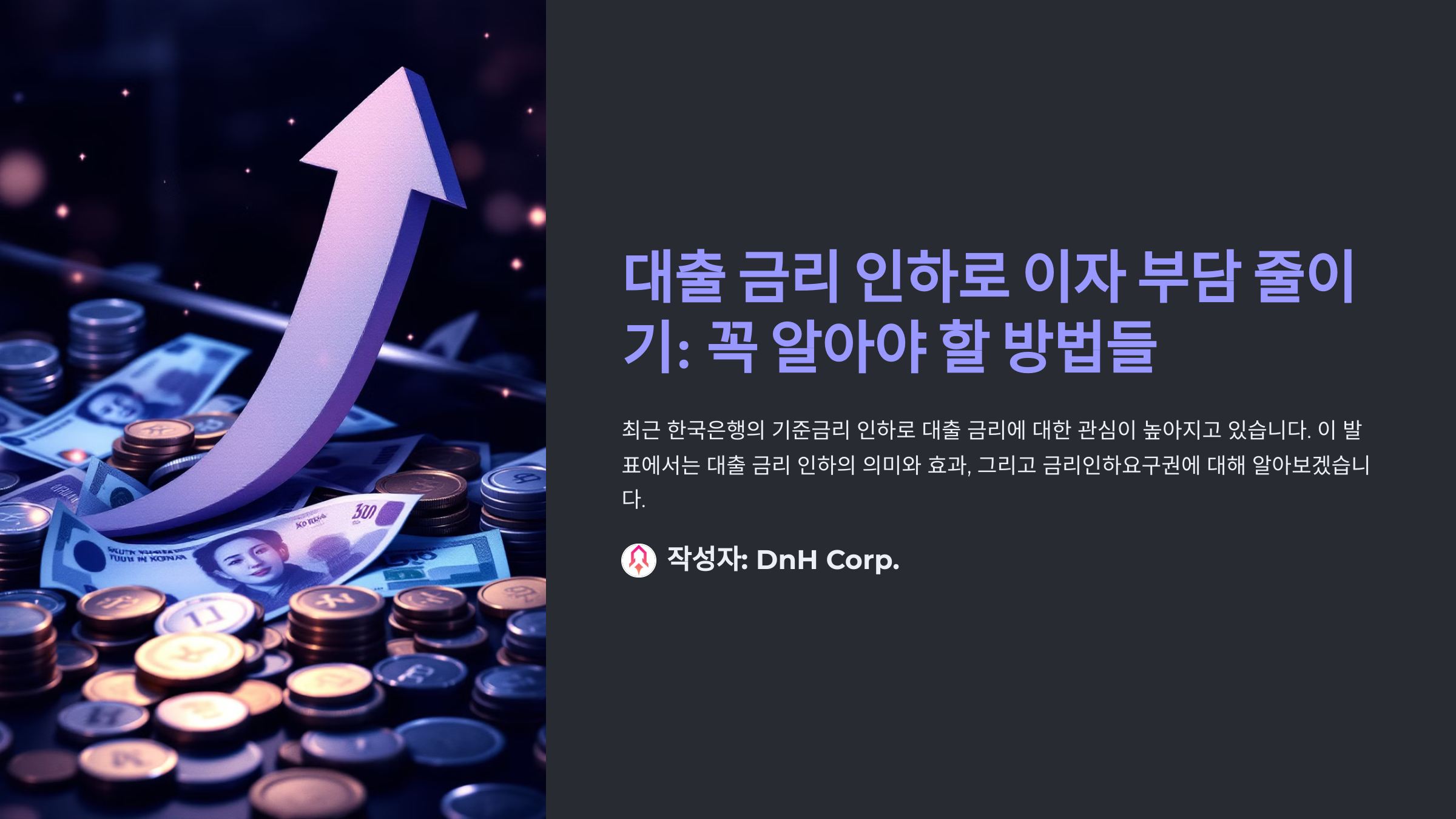 최근 한국은행의 기준금리 인하로 인해 대출 금리에 대한 관심이 높아지고 있습니다. 대출 금리가 하락하면 가계와 기업의 이자 부담이 감소하여 경제 전반에 긍정적인 영향을 미칠 수 있습니다. 이번 글에서는 대출 금리 인하의 의미와 그에 따른 이자 부담 감소 효과, 그리고 개인이 활용할 수 있는 금리인하요구권에 대해 자세히 알아보겠습니다.