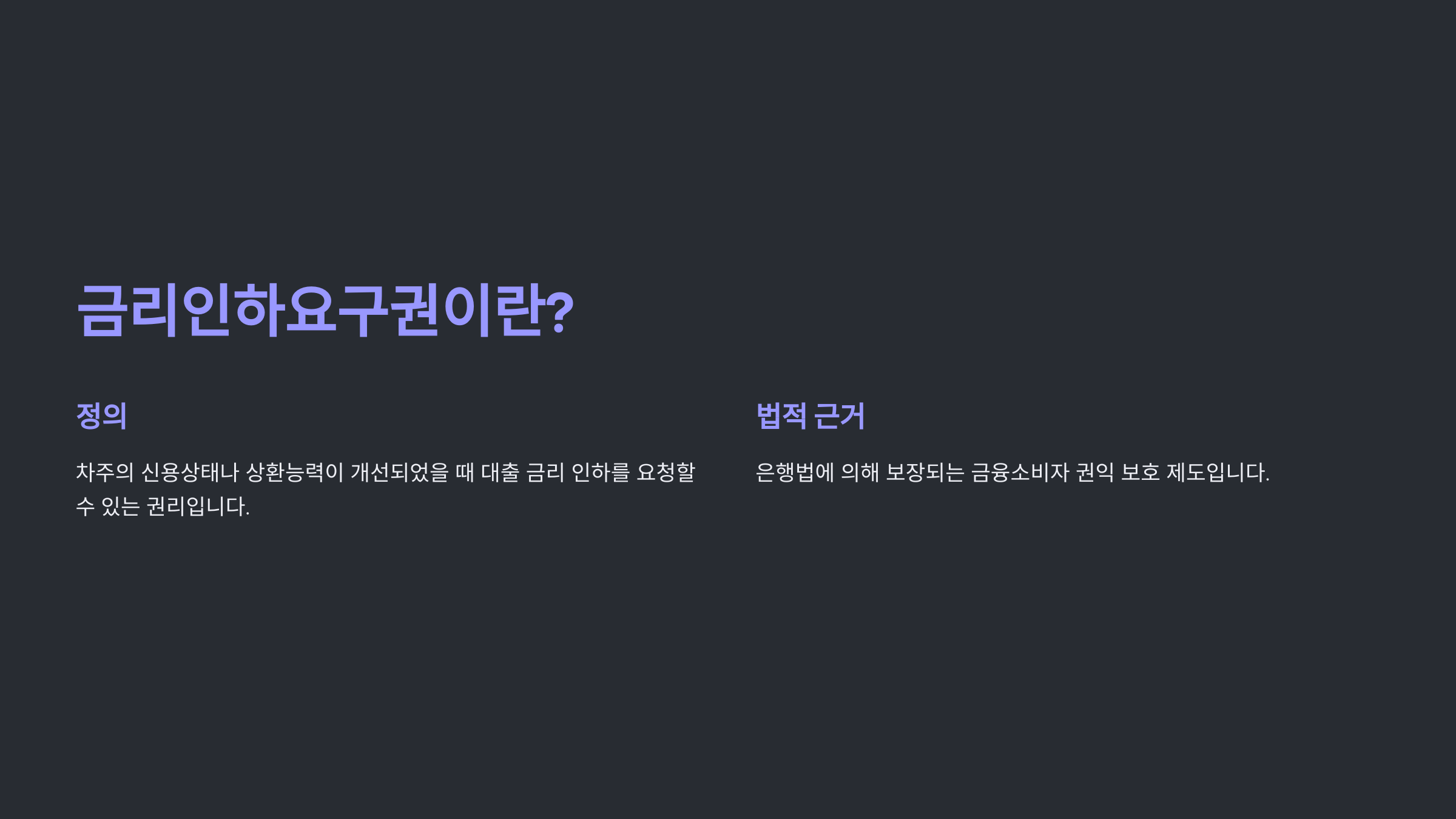 금리인하요구권은 대출을 받은 후 차주의 신용상태나 상환능력이 개선되었을 때 금융기관에 대출 금리 인하를 요청할 수 있는 권리를 말합니다. 이는 금융소비자의 권익을 보호하기 위한 제도로, 은행법에 의해 보장되고 있습니다. :contentReference[oaicite:2]{index=2}