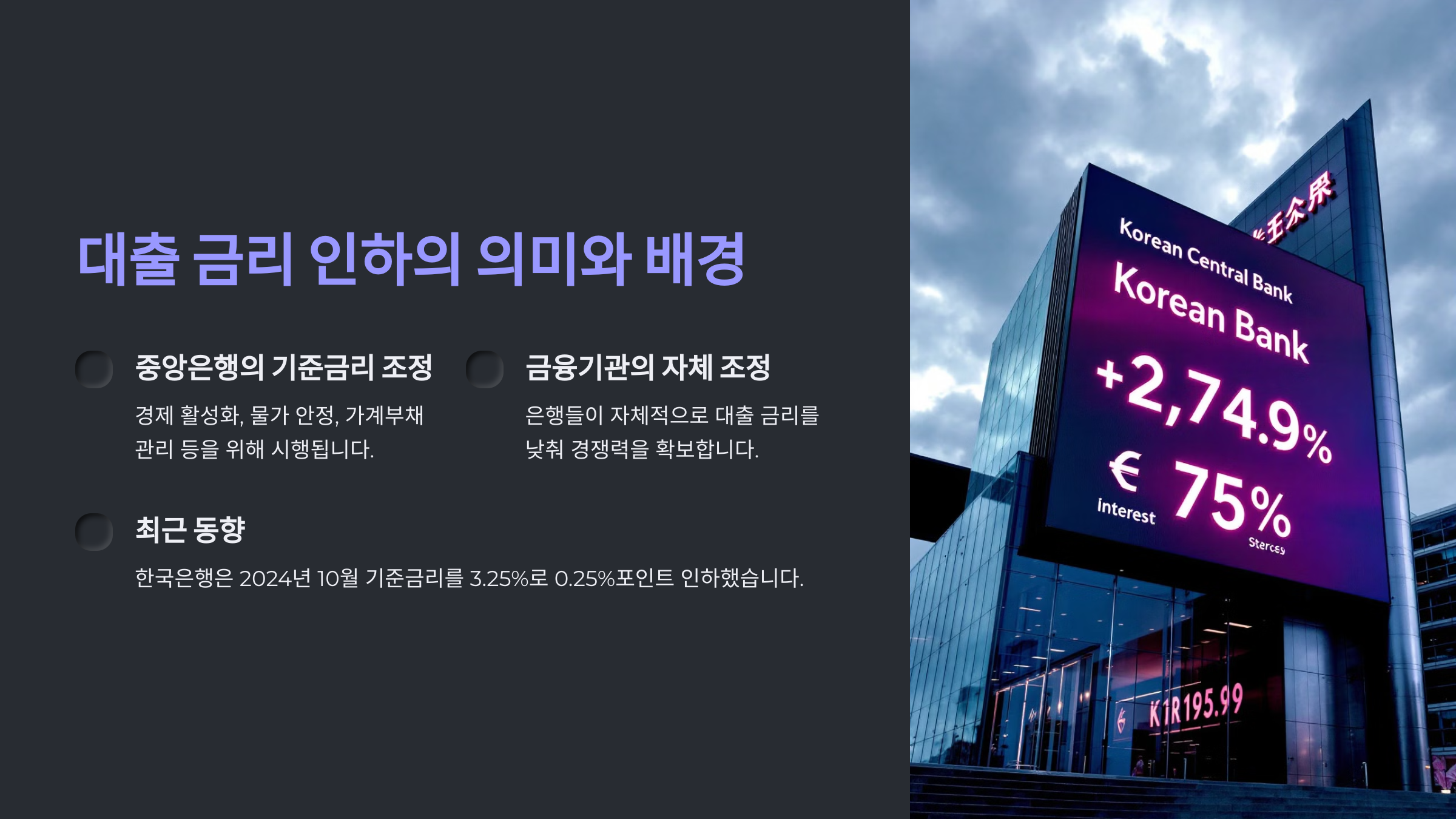 대출 금리 인하는 중앙은행이 기준금리를 낮추거나 금융기관이 자체적으로 대출 금리를 조정함으로써 이루어집니다. 이러한 금리 인하는 경제 활성화, 물가 안정, 가계부채 관리 등의 목적을 가지고 시행됩니다. 예를 들어, 한국은행은 2024년 10월 기준금리를 0.25%포인트 인하하여 3.25%로 조정하였습니다. 이는 38개월 만의 금리 인하로, 물가 안정과 가계대출 증가세 둔화를 고려한 결정이었습니다. :contentReference[oaicite:0]{index=0}