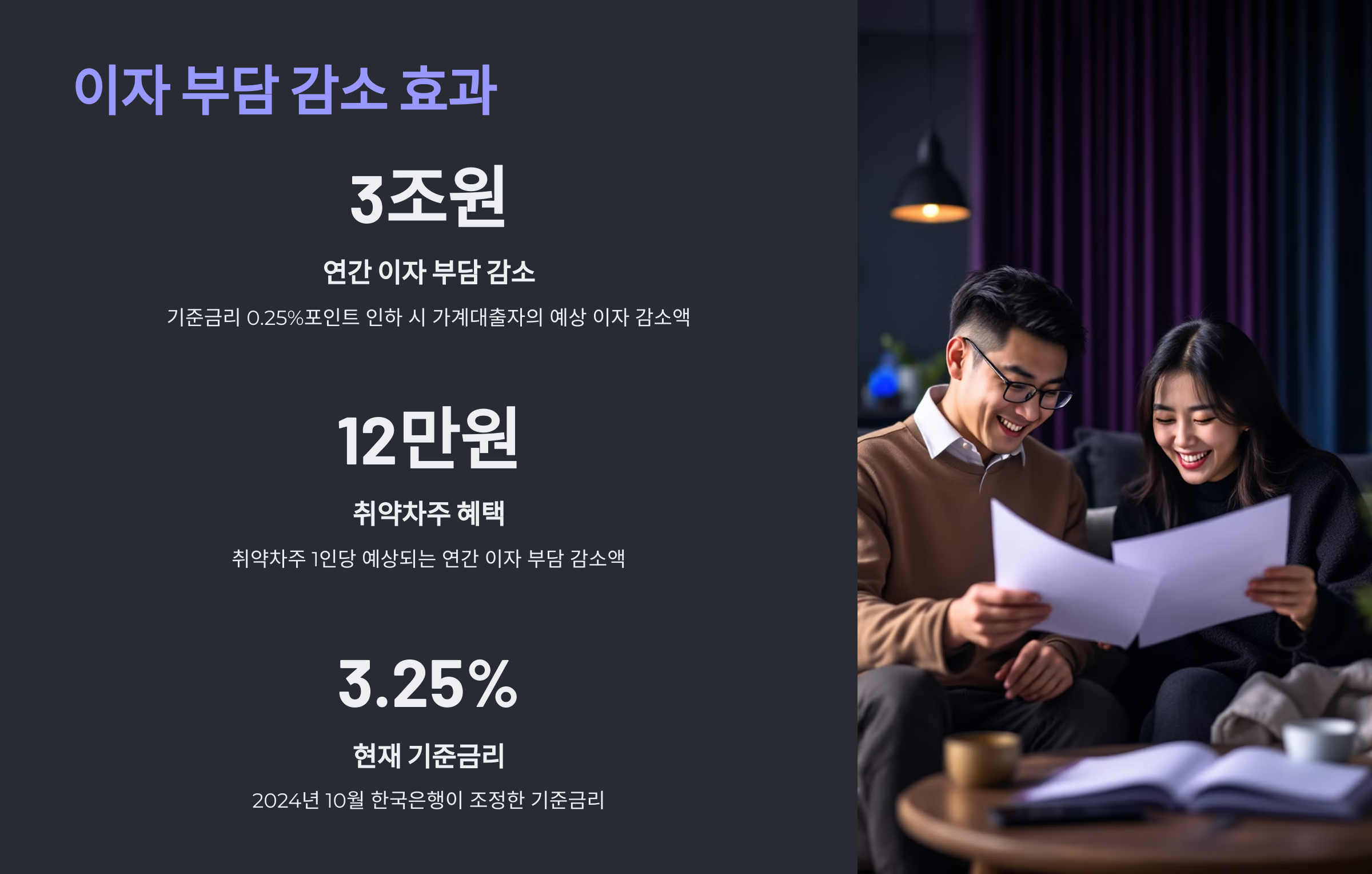 대출 금리가 인하되면 가계와 기업의 이자 부담이 줄어들게 됩니다. 한국은행에 따르면, 기준금리가 0.25%포인트 인하될 경우 가계대출자의 연간 이자 부담이 약 3조 원 감소할 것으로 추정됩니다. 이는 고소득자, 중소득자, 저소득자 모두에게 긍정적인 영향을 미치며, 특히 취약차주의 경우 1인당 약 12만 원의 이자 부담이 줄어들 것으로 예상됩니다. :contentReference[oaicite:1]{index=1}