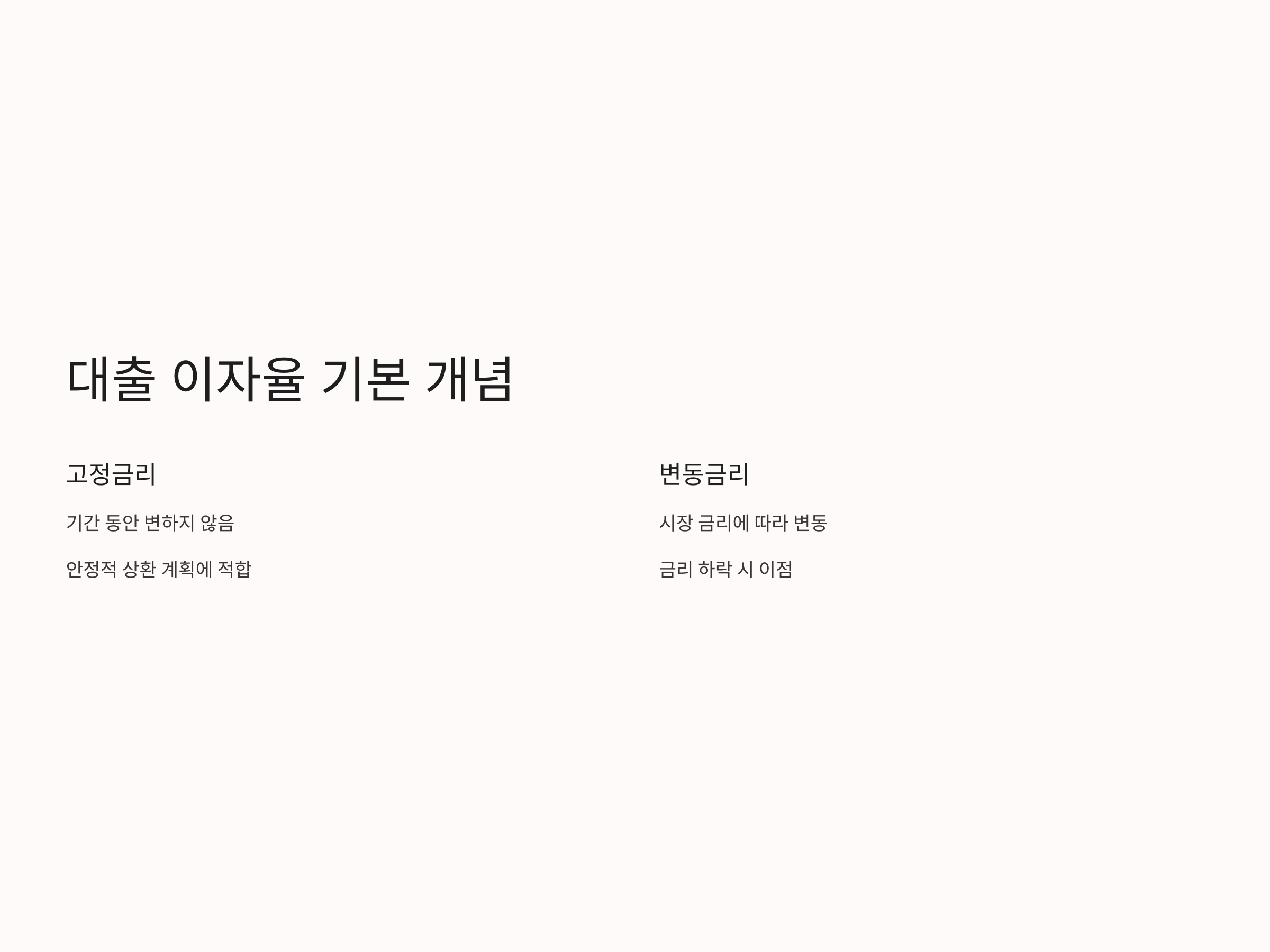- 고정금리: 대출 기간 동안 이자율이 변하지 않으며, 안정적인 상환 계획을 세우기에 적합합니다.