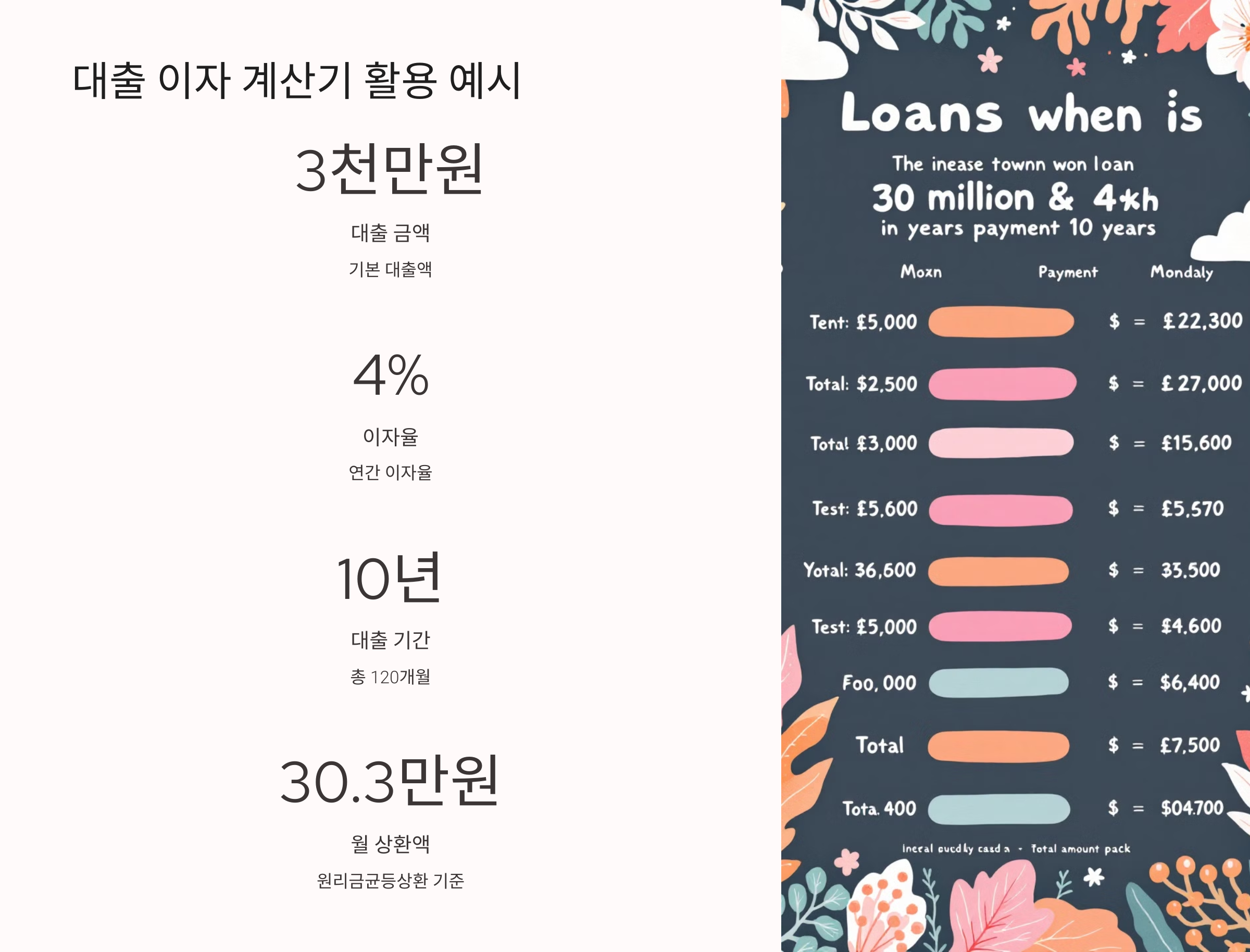 예를 들어, 3,000만원을 대출받고 이자율 4%, 대출 기간 10년으로 계산기를 사용한다고 가정해봅시다. 이 경우, 대출 금액에 대한 월 상환 금액과 이자 총액을 계산해보면 다음과 같습니다.