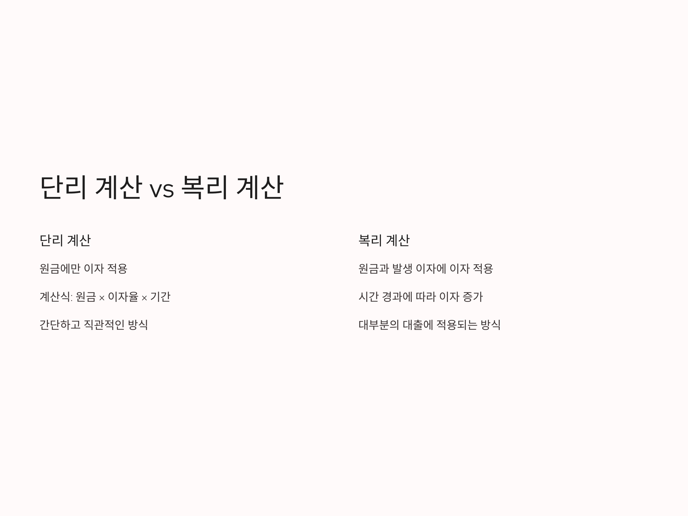 단리 계산 방식은 대출 금액에 이자율을 곱한 뒤 대출 기간을 곱하는 방식으로, 간단하고 직관적인 방법입니다. 반면 복리 계산 방식은 이자가 시간이 지남에 따라 계속해서 증가하는 방식으로, 이자율이 계속 적용되는 형태입니다. 대출을 받을 때는 복리 방식이 적용되는 경우가 많기 때문에 이를 이해하는 것이 중요합니다.