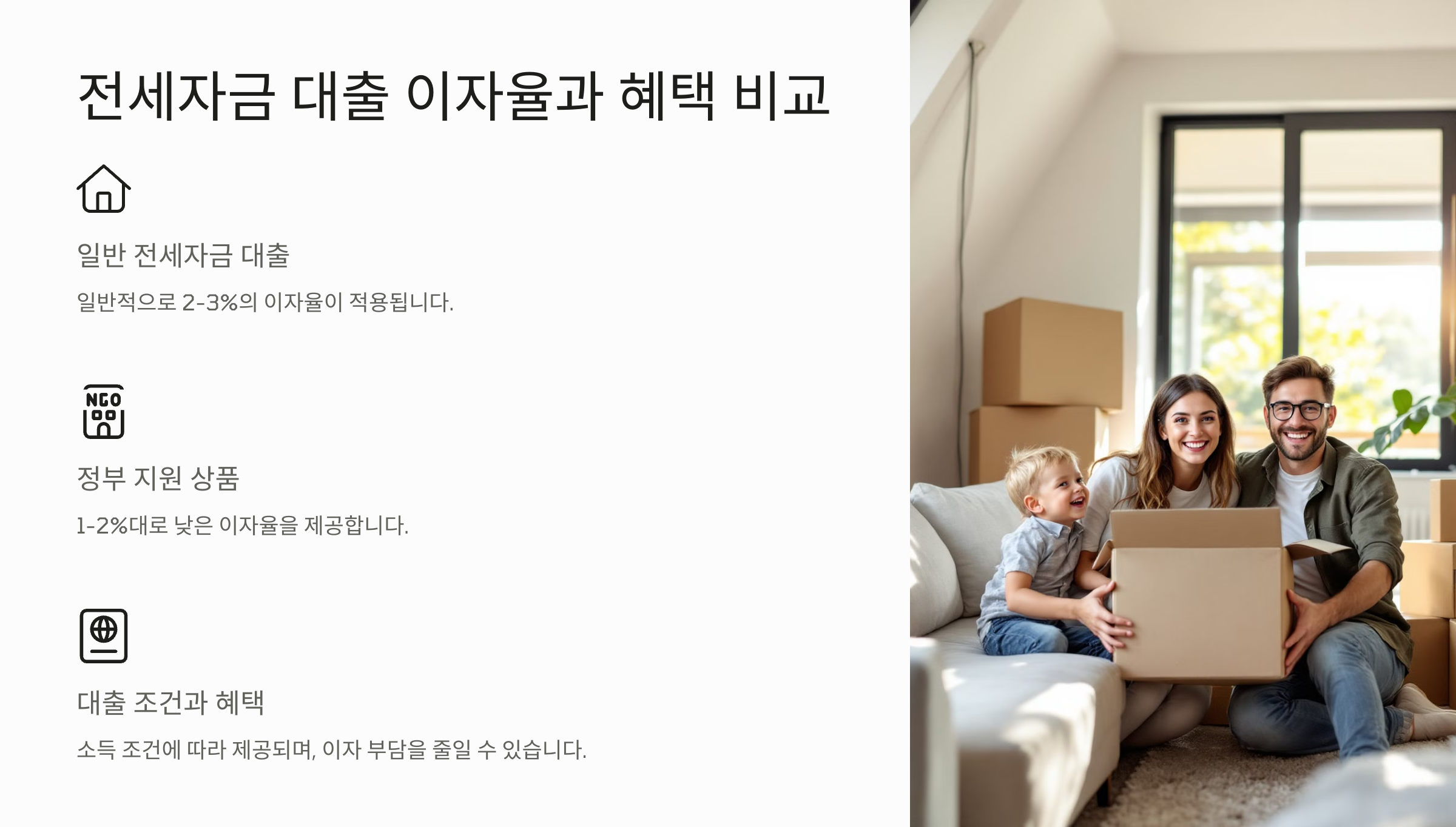 - 주요 금융권의 전세자금 대출: 일반적으로 2~3%의 이자율이 적용되며, 정부 지원 상품의 경우 1~2%대로 낮은 이자율을 제공합니다.