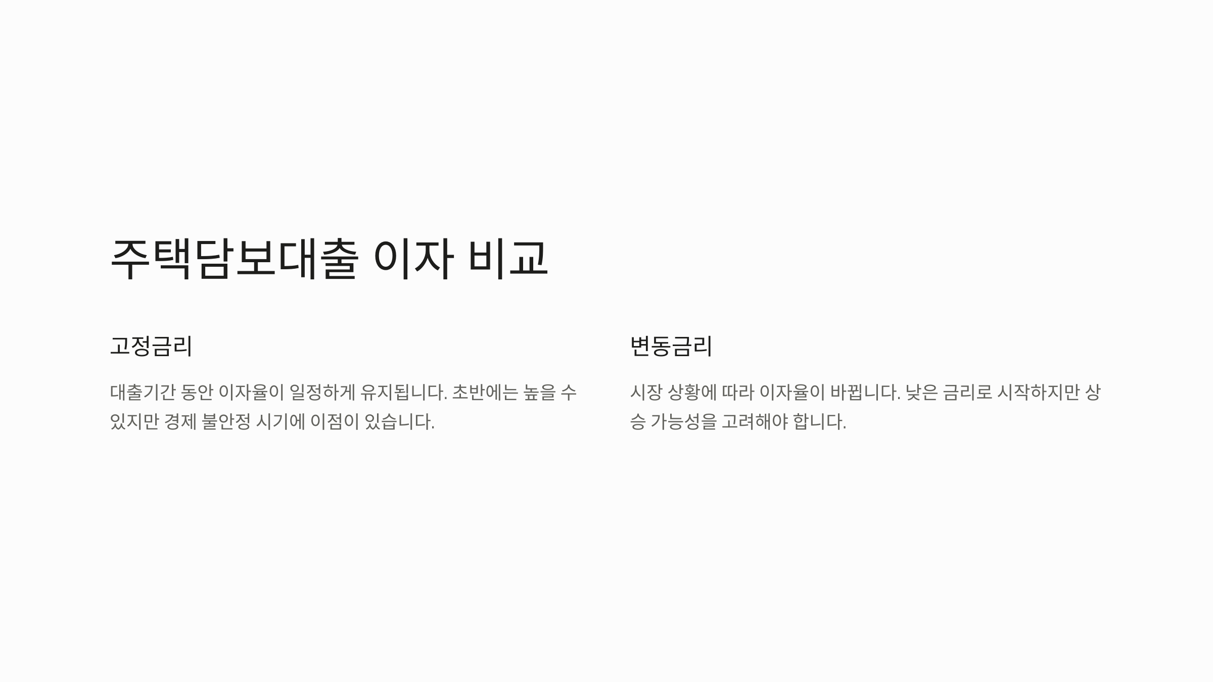 - 고정금리 vs 변동금리: 고정금리는 대출기간 동안 이자율이 일정하게 유지되지만 변동금리는 시장 상황에 따라 이자율이 바뀝니다.