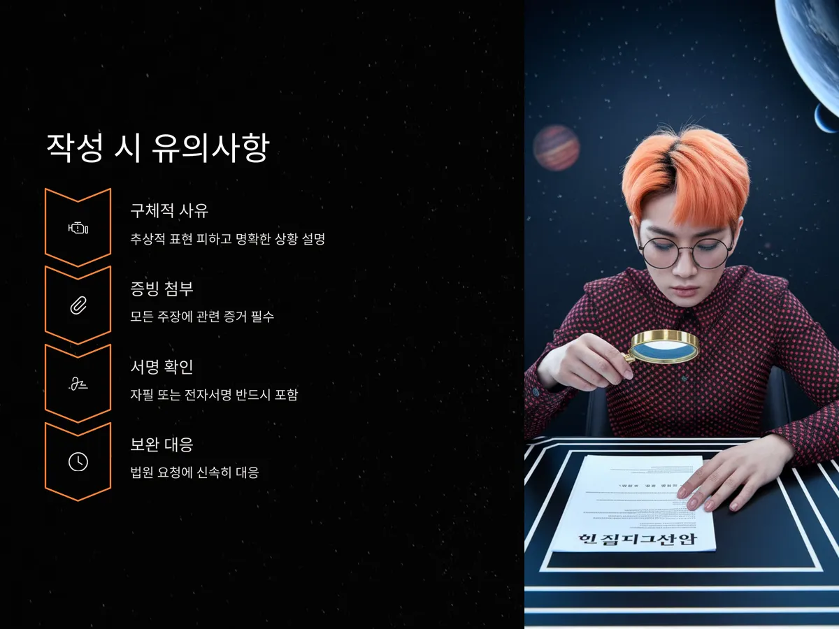 이러한 실수를 방지하기 위해, 작성 전 법원의 최근 양식 및 사례를 반드시 확인해야 하며, 필요 시 법률전문가의 자문을 받는 것도 고려해볼 수 있습니다. 실제로 동일한 사유라도 문장의 흐름이나 증빙의 적절성에 따라 인용 여부가 갈리는 경우가 많기 때문입니다.