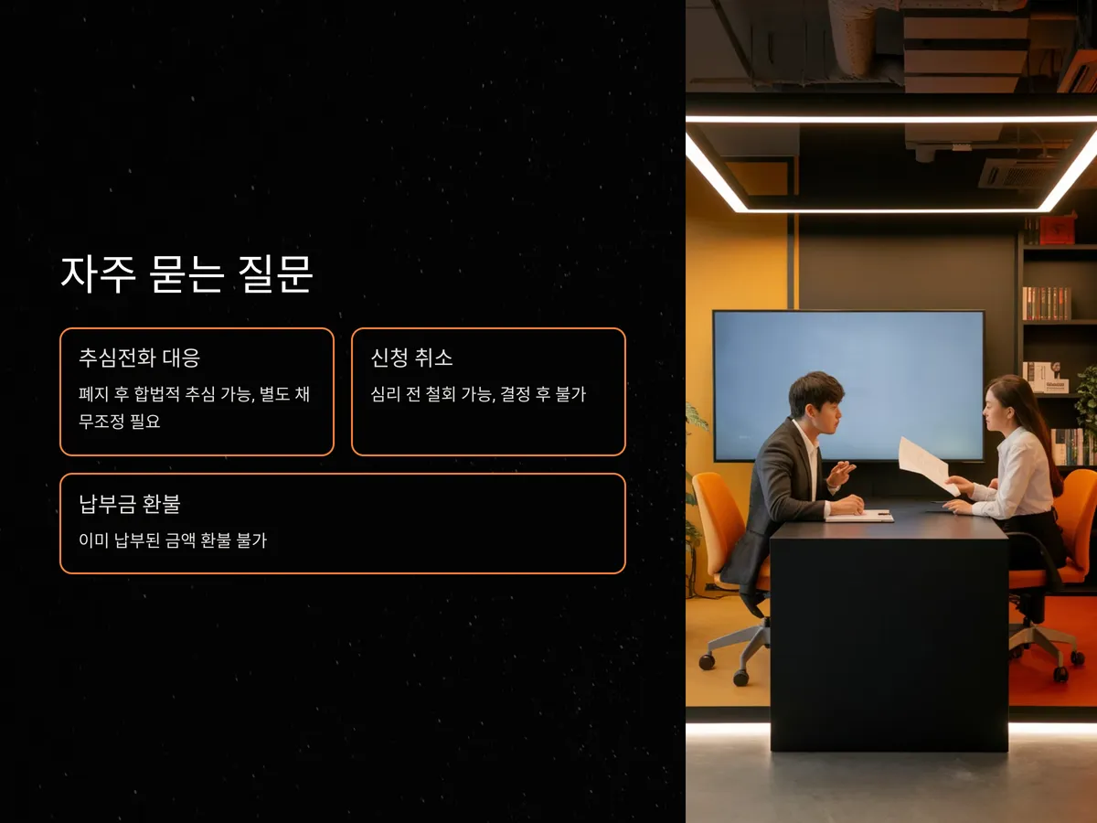 A: 폐지 이후에는 채무가 부활하므로, 채권자들이 합법적으로 추심할 수 있습니다. 이 경우 추심 중단을 원하면 별도의 채무조정 절차를 다시 진행해야 합니다.