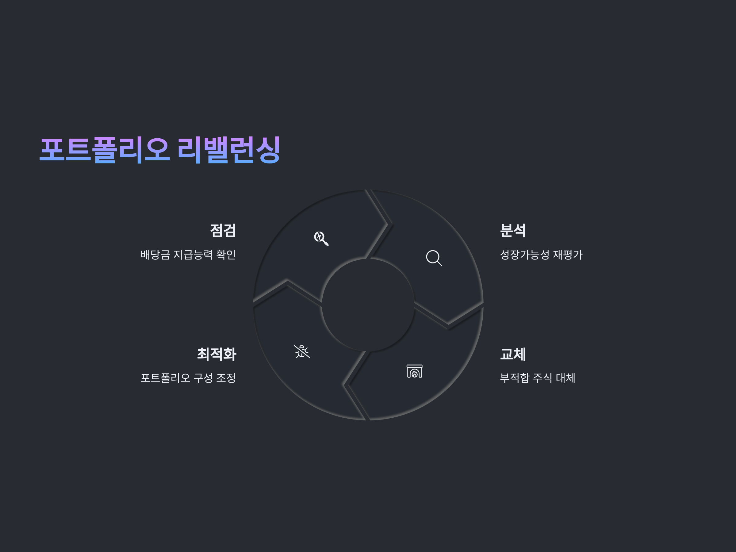 배당 성장 포트폴리오는 시간이 지나면서 리밸런싱이 필요할 수 있습니다. 기업들의 배당금 지급 능력이나 재정 상태가 변화할 수 있기 때문에, 주기적으로 포트폴리오를 점검하고 필요에 따라 주식을 교체하는 것이 중요합니다.