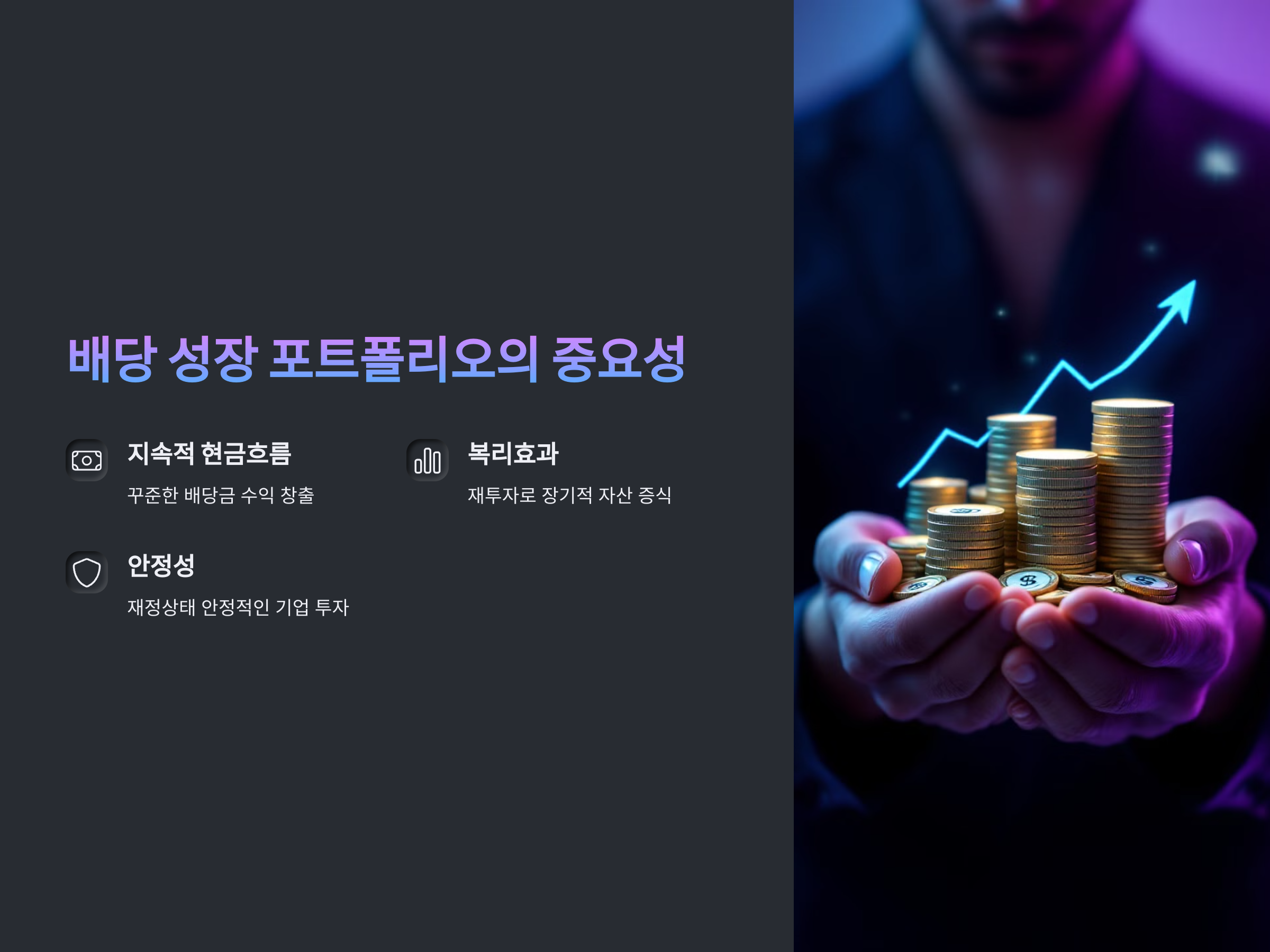 배당 성장 포트폴리오의 가장 큰 장점은 지속적으로 증가하는 배당금 수익입니다. 기업이 성장하면서 배당금을 늘려가는 경우, 투자자는 배당금으로 꾸준한 수익을 얻을 수 있습니다. 특히 장기 투자자들에게는 재투자된 배당금이 시간이 지남에 따라 상당한 성장을 이룰 수 있습니다. 또한, 배당금을 지급하는 기업은 일반적으로 재정 상태가 안정적인 경우가 많아, 비교적 리스크가 적은 투자처로 평가됩니다.