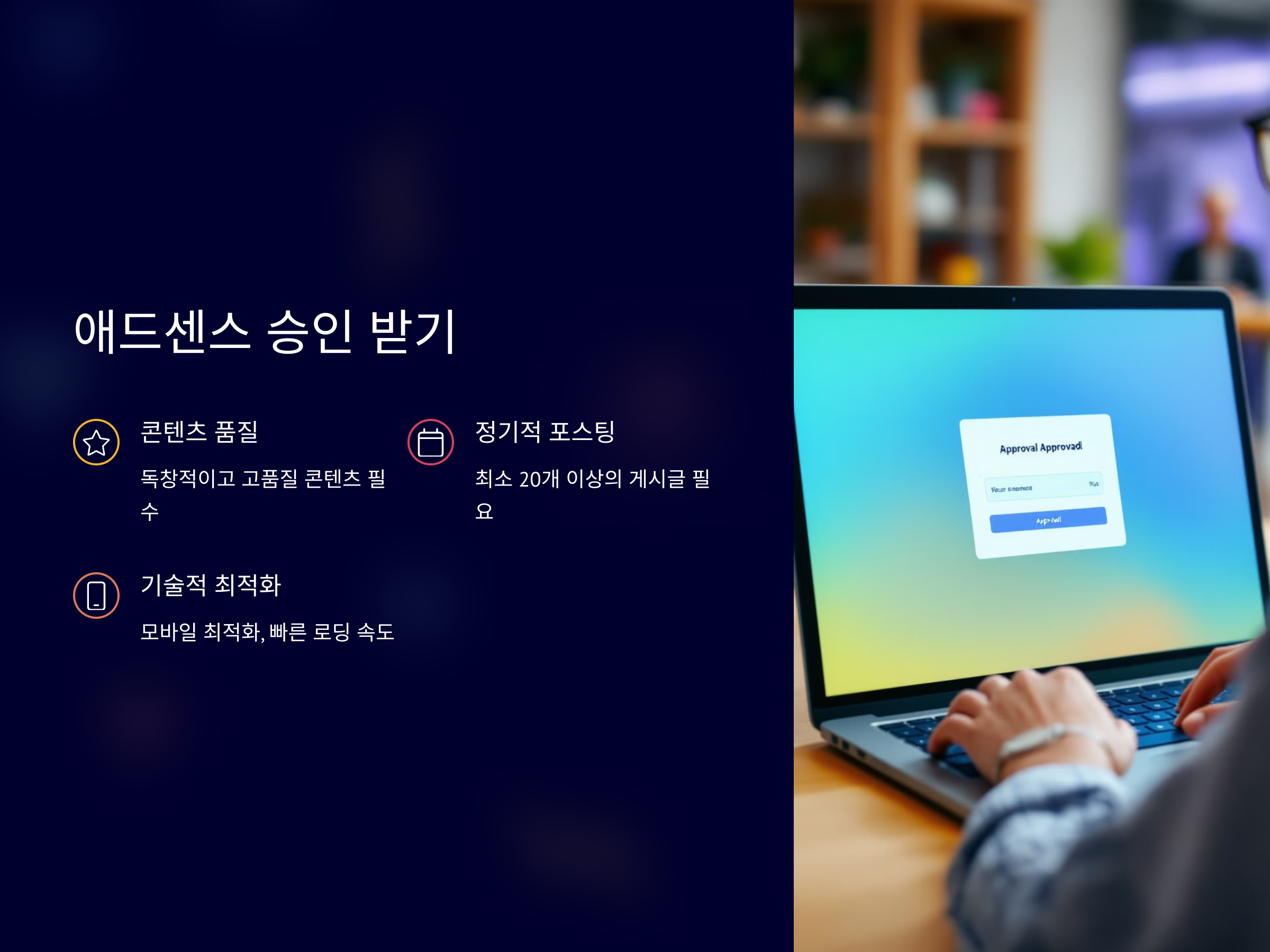 또한, 정기적인 포스팅과 양질의 콘텐츠가 중요합니다. 애드센스 승인을 위한 최소 요구 사항은 보통 20개 이상의 게시글과 일정한 방문자 수입니다. 이 기본 조건을 만족시키는 것 외에도, 모바일 최적화, 빠른 로딩 속도, 정리된 레이아웃 등을 고려해야 합니다. 이러한 조건을 충족하면 애드센스 승인을 받을 확률이 높아집니다.
