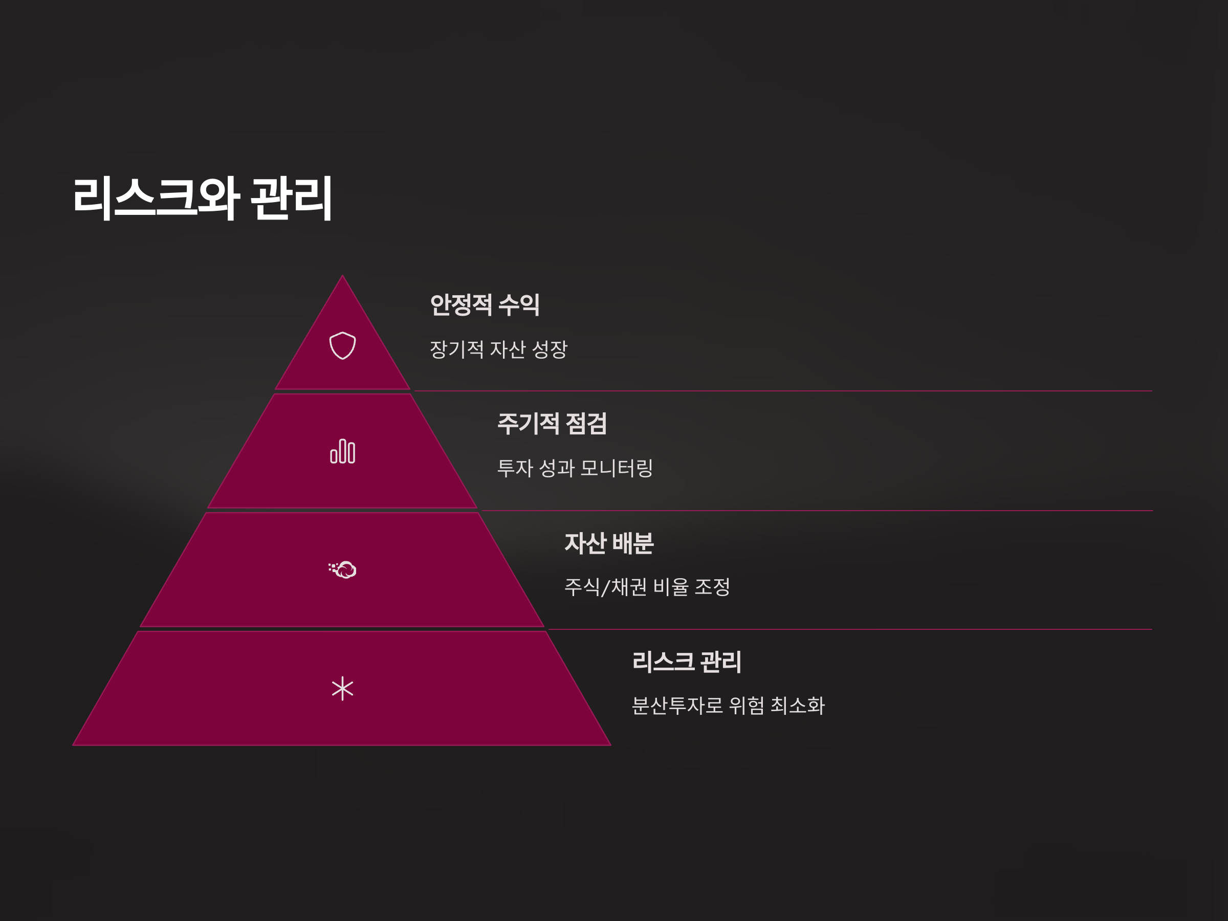 연금저축보험이 안정적인 금융 상품이라 하더라도 리스크가 전혀 없는 것은 아닙니다. 특히 주식형 포트폴리오를 선택했을 경우 시장의 변동성에 영향을 받을 수 있습니다. 따라서, 투자의 성과를 예측하고 장기적으로 자산을 성장시키기 위해서는 리스크 관리가 매우 중요합니다. 투자자의 위험 선호도를 고려해 포트폴리오를 설정하고, 주기적으로 투자 성과를 점검하여 필요한 조정을 하는 것이 필요합니다.