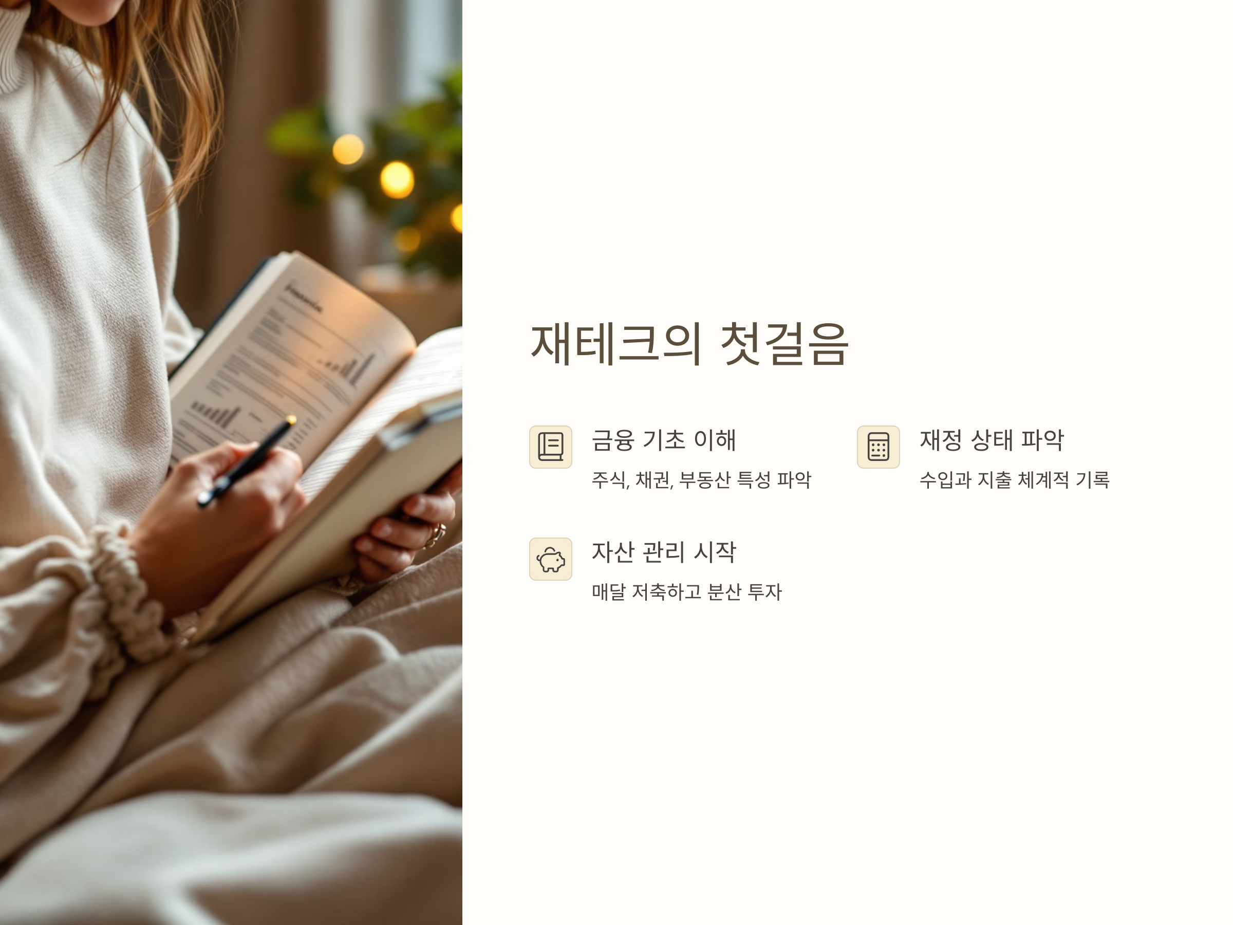 재테크의 핵심은 자신의 재정 상태를 정확히 파악하고, 이를 기반으로 자산을 어떻게 관리할지 결정하는 것입니다. 예를 들어, 매달 일정 부분을 저축하고, 그 돈을 적절히 분산하여 투자하는 방법을 적용해보세요. 이때 투자에 대한 이해가 부족하면, 안전한 자산군인 적금이나 채권을 선택하는 것이 좋습니다.