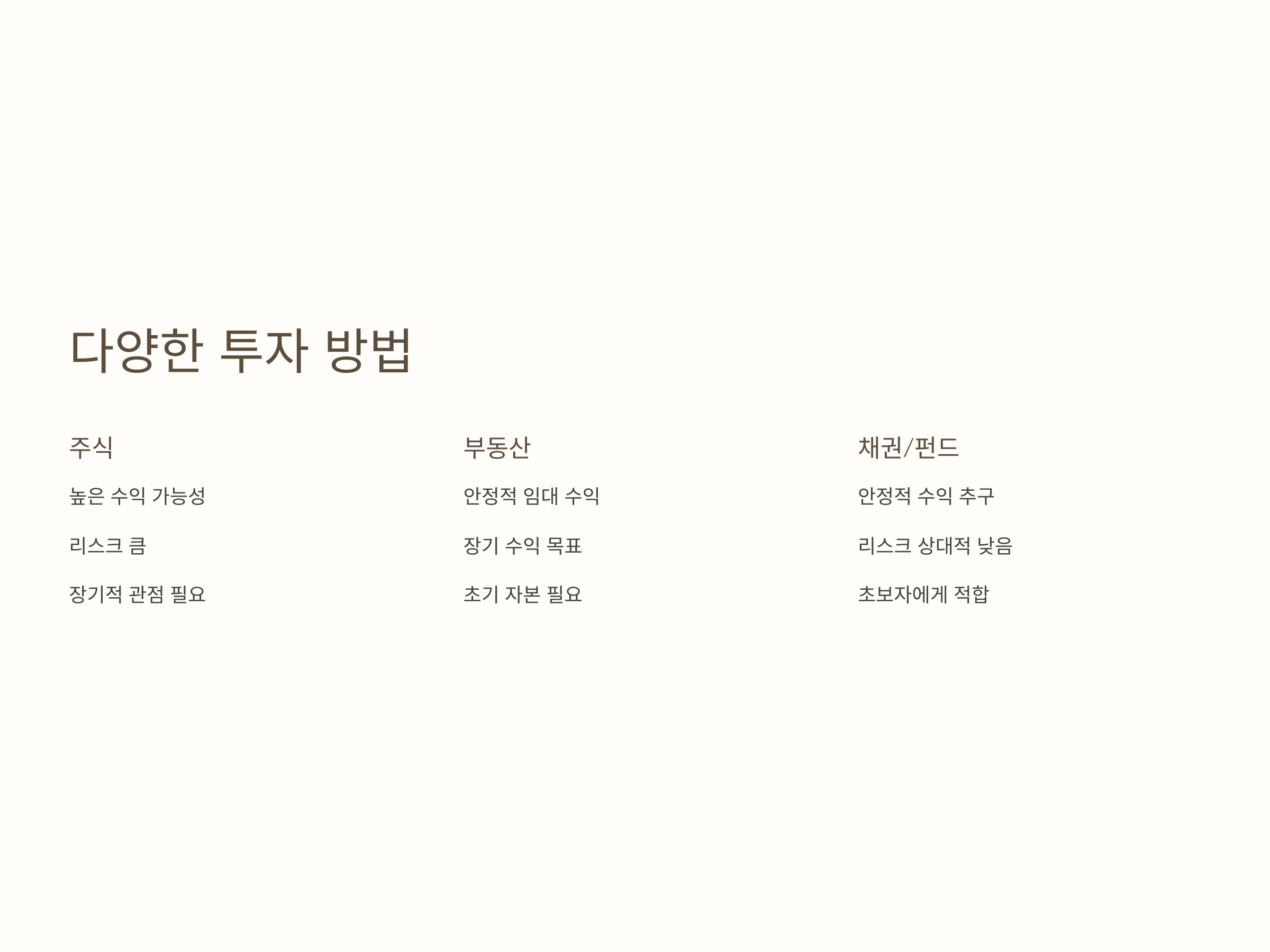 재테크를 제대로 시작하려면 다양한 투자 방법에 대해 알아보는 것이 중요합니다. 주식, 부동산, 채권, 펀드 등 다양한 투자 수단이 있지만, 각자에게 맞는 투자 방법을 선택해야 합니다. 예를 들어, 안정적인 수익을 원하는 사람은 채권이나 안정적인 펀드를 선택할 수 있습니다. 반면, 더 높은 수익을 추구한다면 주식 투자가 적합할 수 있습니다.