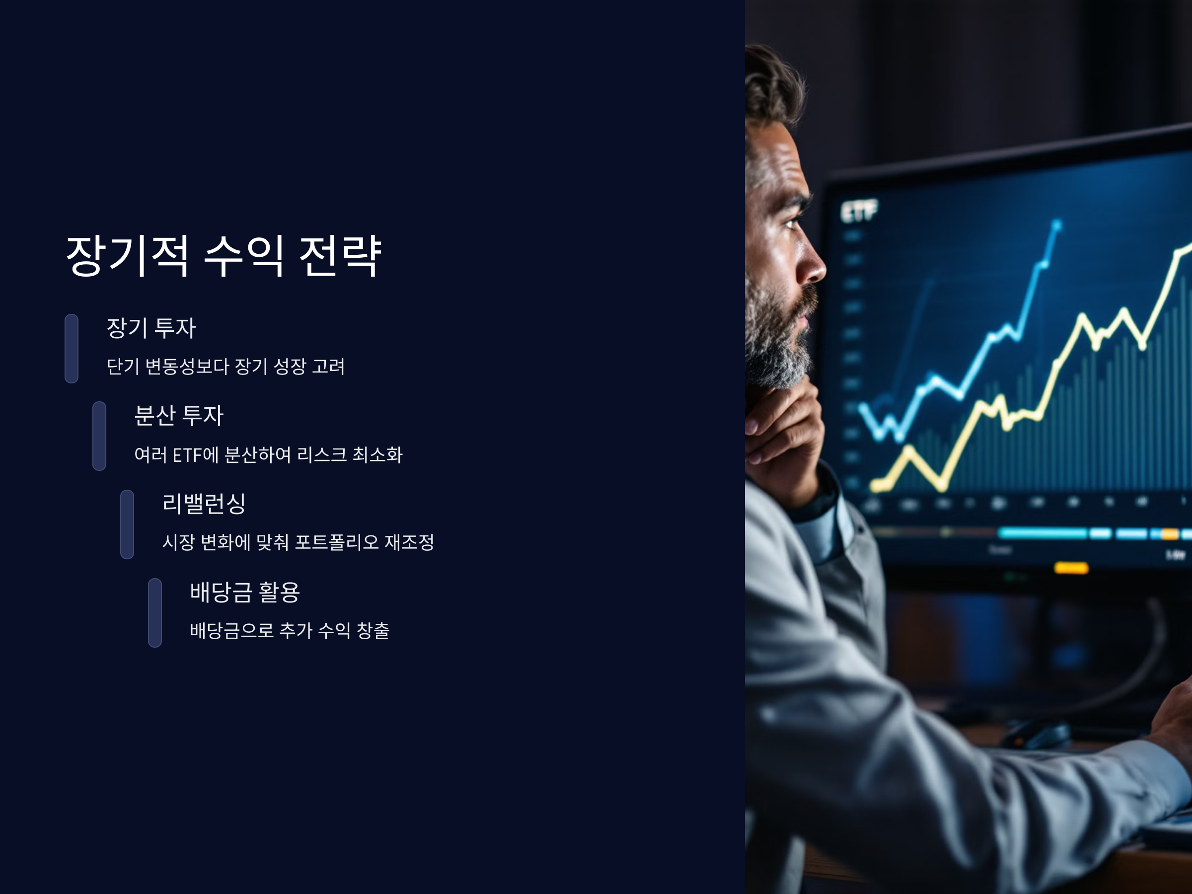 장기적인 수익을 얻기 위해서는 분산 투자와 주기적인 리밸런싱이 필요합니다. 즉, 한 종목이나 자산군에 집중하는 것보다는 여러 ETF에 분산 투자하여 리스크를 최소화하고, 시장의 변화에 맞게 포트폴리오를 재조정하는 전략이 중요합니다. 또한, ETF는 배당금을 지급하는 경우가 많기 때문에 이를 활용하여 추가적인 수익을 올리는 방법도 고려할 수 있습니다.