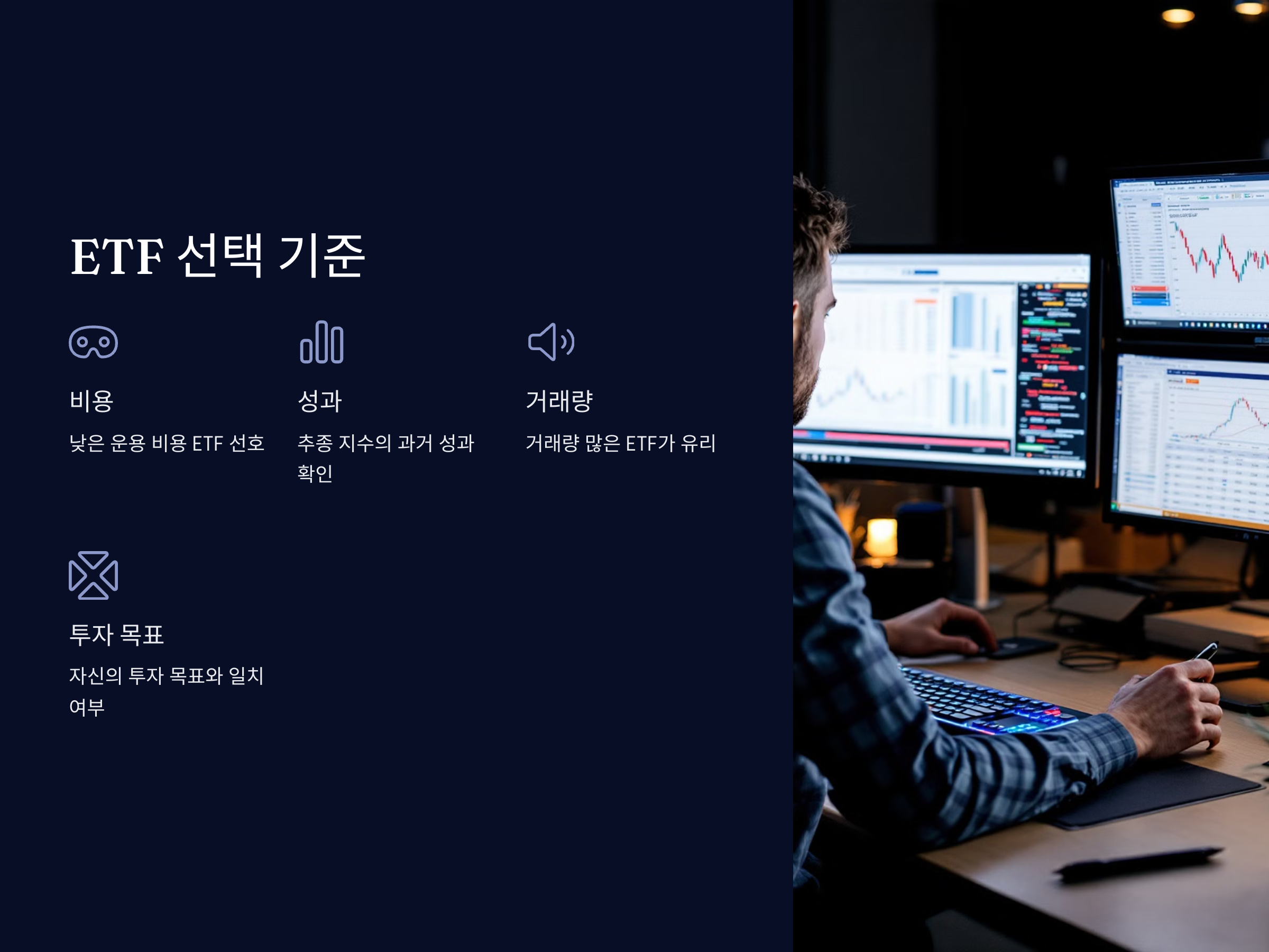 ETF를 선택할 때는 비용, 추종하는 지수의 성과, 거래량 등을 고려해야 합니다. 비용이 낮고 거래량이 많은 ETF는 더 많은 투자자들이 거래하고 있다는 신뢰를 제공하며, 상대적으로 유리한 조건을 가지고 있습니다. 또한, 각 ETF가 추종하는 지수나 자산군이 자신의 투자 목표와 잘 맞는지 확인하는 것도 매우 중요합니다.