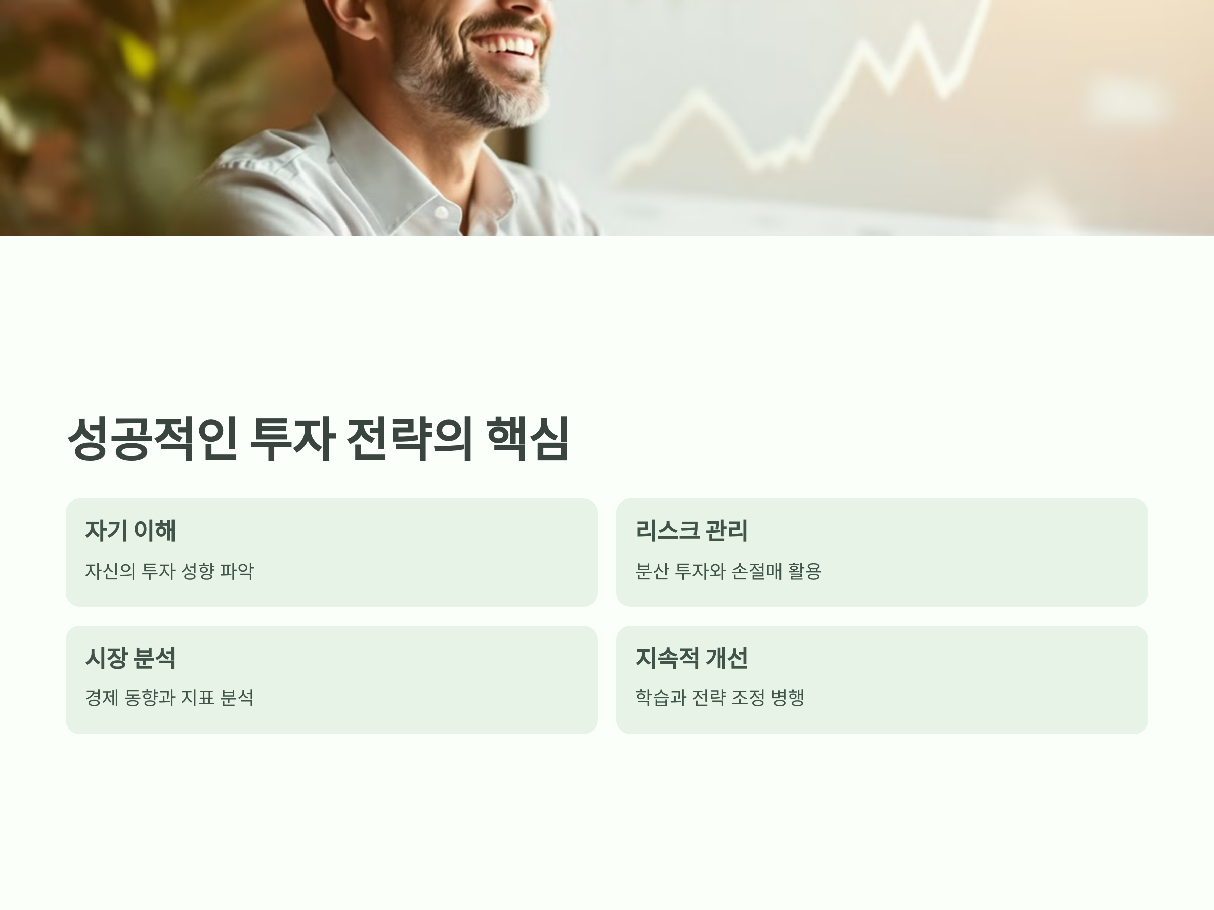 성공적인 투자 전략은 자신에게 맞는 스타일을 파악하고, 리스크를 관리하며, 경제 동향을 분석하는 것입니다. 다양한 자산군에 적합한 전략을 선택하고, 이를 실천에 옮기면서 지속적으로 전략을 점검하는 것이 중요합니다. 또한, 투자 전략을 실행할 때는 계획적인 목표 설정과 정기적인 점검이 필요합니다.
