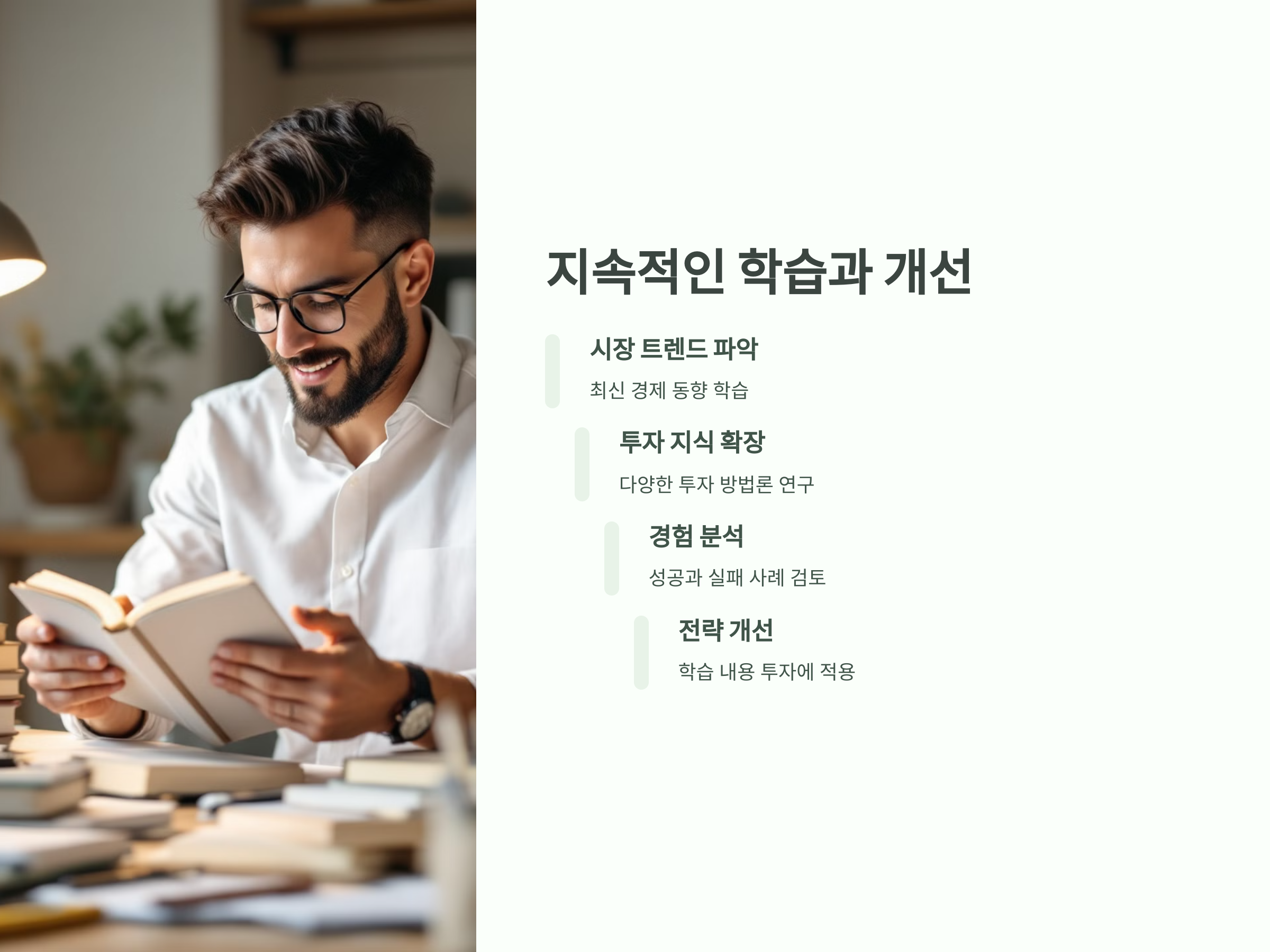 투자는 시간이 지나면서 변화합니다. 시장의 변동성, 경제의 변화 등은 투자 전략을 계속해서 수정하도록 요구합니다. 따라서, 지속적인 학습과 자기 개발이 필요하며, 다른 투자자들의 의견을 듣고, 자신의 투자 스타일을 점차적으로 개선해 나가는 것이 중요합니다.