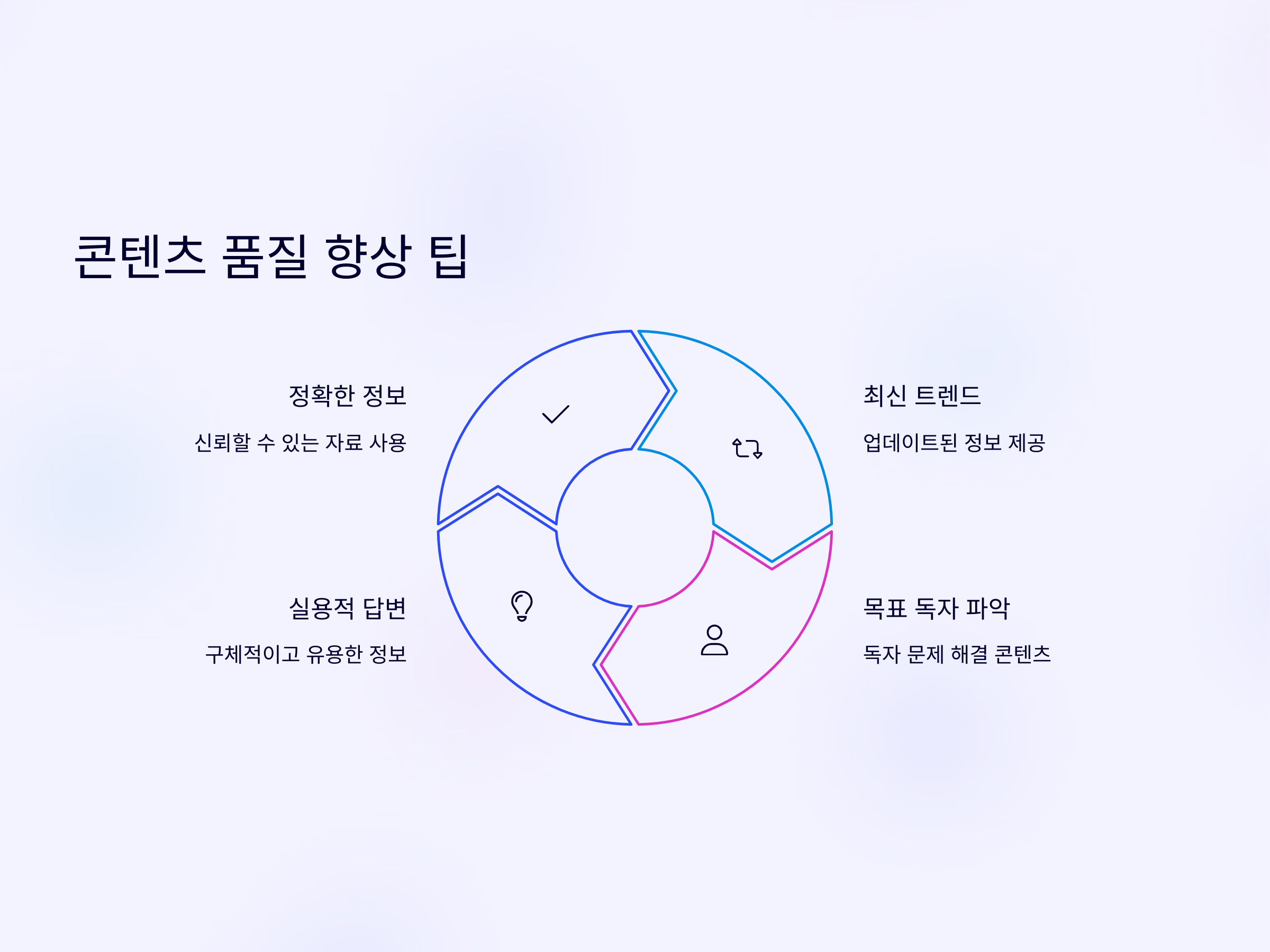구글은 콘텐츠의 품질을 매우 중요하게 여깁니다. 사용자 경험을 고려하여 유익하고, 구체적이며 신뢰할 수 있는 정보를 제공하는 것이 핵심입니다. 이를 위해서는 정확한 정보와 업데이트된 자료를 사용해야 합니다. 최신 트렌드와 정보를 반영하여, 블로그 글이 항상 최신 상태로 유지될 수 있도록 해야 합니다.