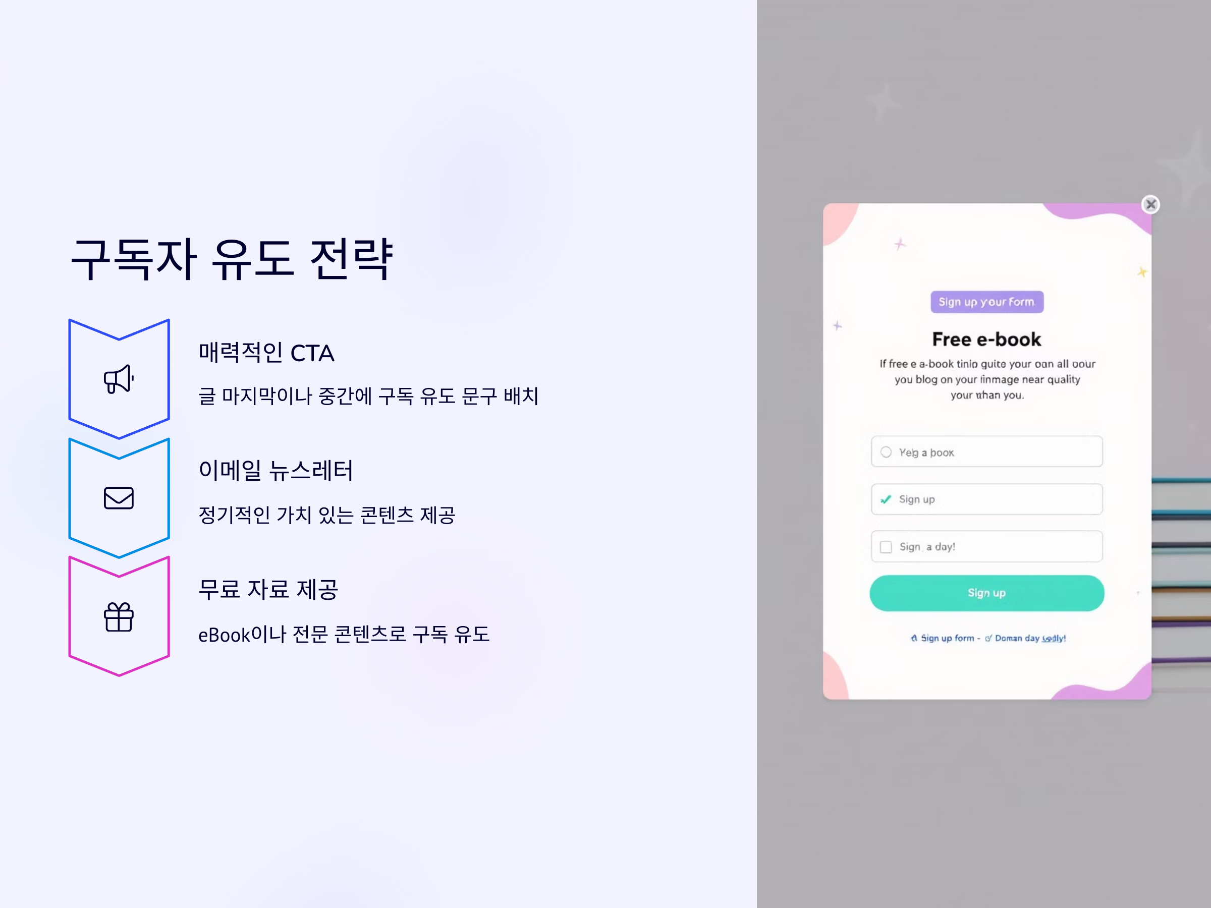 또한, 이메일 뉴스레터나 무료 자료 제공 등의 방법을 통해 구독자에게 가치를 제공하는 것도 중요한 전략입니다. 예를 들어, "무료 eBook 제공" 또는 "전문적인 블로그 콘텐츠 제공" 등을 통해 방문자가 구독하게 유도할 수 있습니다. 이러한 전략은 구독자를 꾸준히 확보하는 데 매우 효과적입니다.