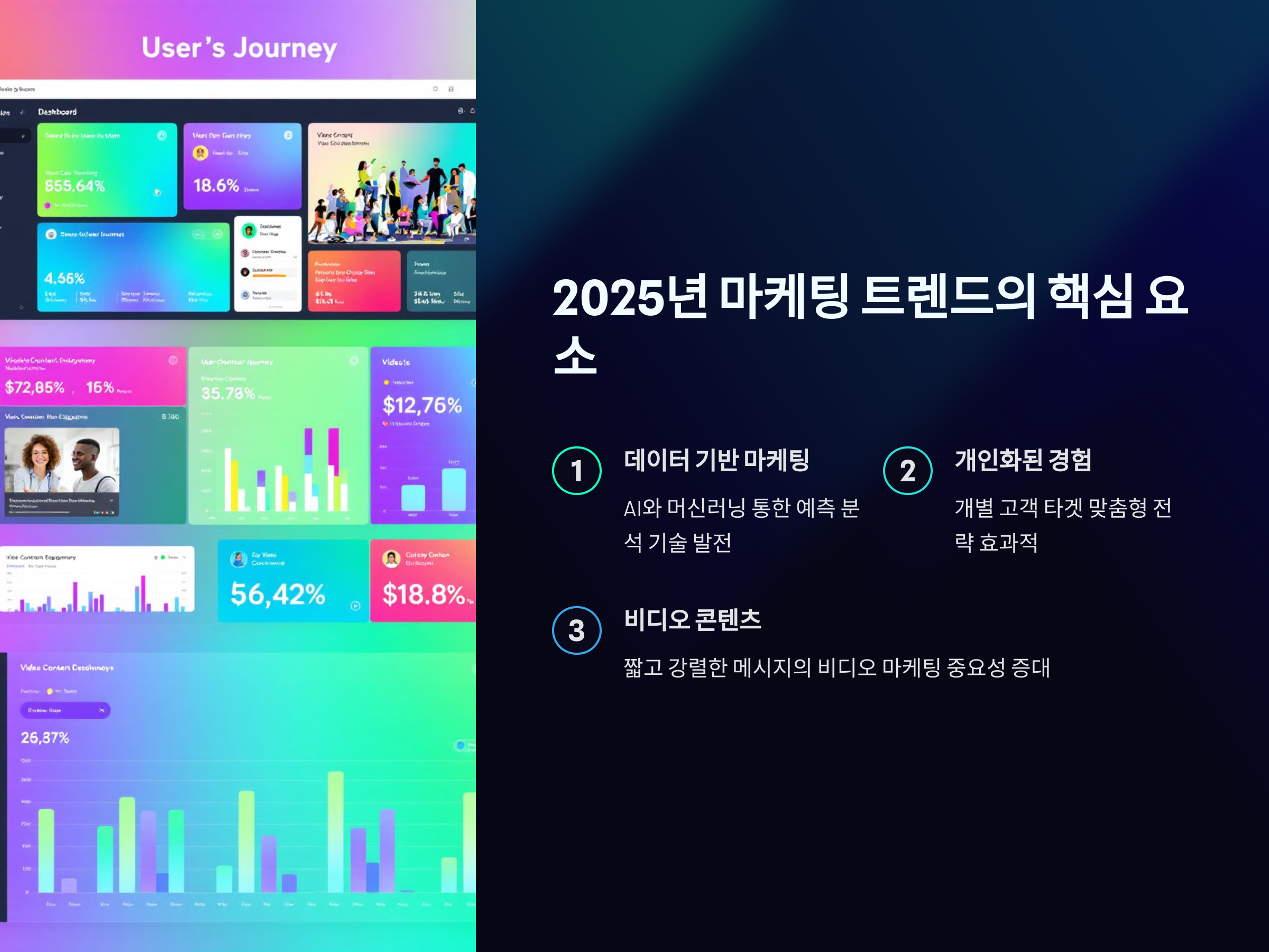 2025년 마케팅 트렌드는 몇 가지 주요 요소로 요약될 수 있습니다. 첫째, 데이터 기반 마케팅의 강화입니다. 기업은 점점 더 많은 데이터를 활용해 고객의 행동 패턴을 분석하고, 이를 기반으로 맞춤형 마케팅 전략을 세우고 있습니다. 특히 AI와 머신러닝을 통한 예측 분석 기술이 빠르게 발전하면서, 고객의 요구와 행동을 미리 예측할 수 있게 되었습니다. 이를 통해 기업은 효율적으로 자원을 배분하고, 더욱 정교한 타겟팅을 통해 마케팅 성과를 극대화할 수 있습니다.