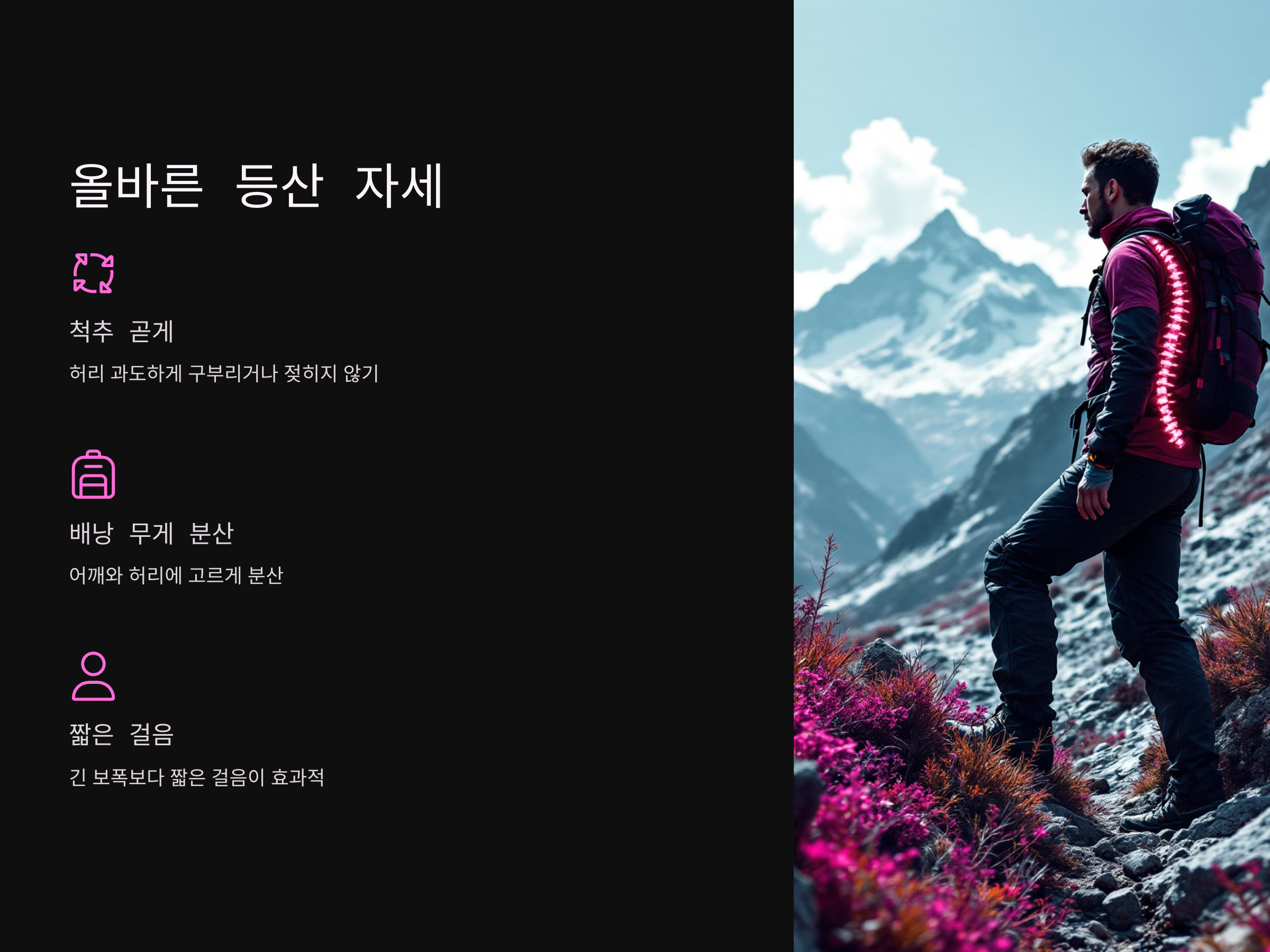등산 중 잘못된 자세는 허리 통증의 주된 원인 중 하나입니다. 아래의 방법을 통해 허리에 가해지는 부담을 최소화할 수 있습니다.