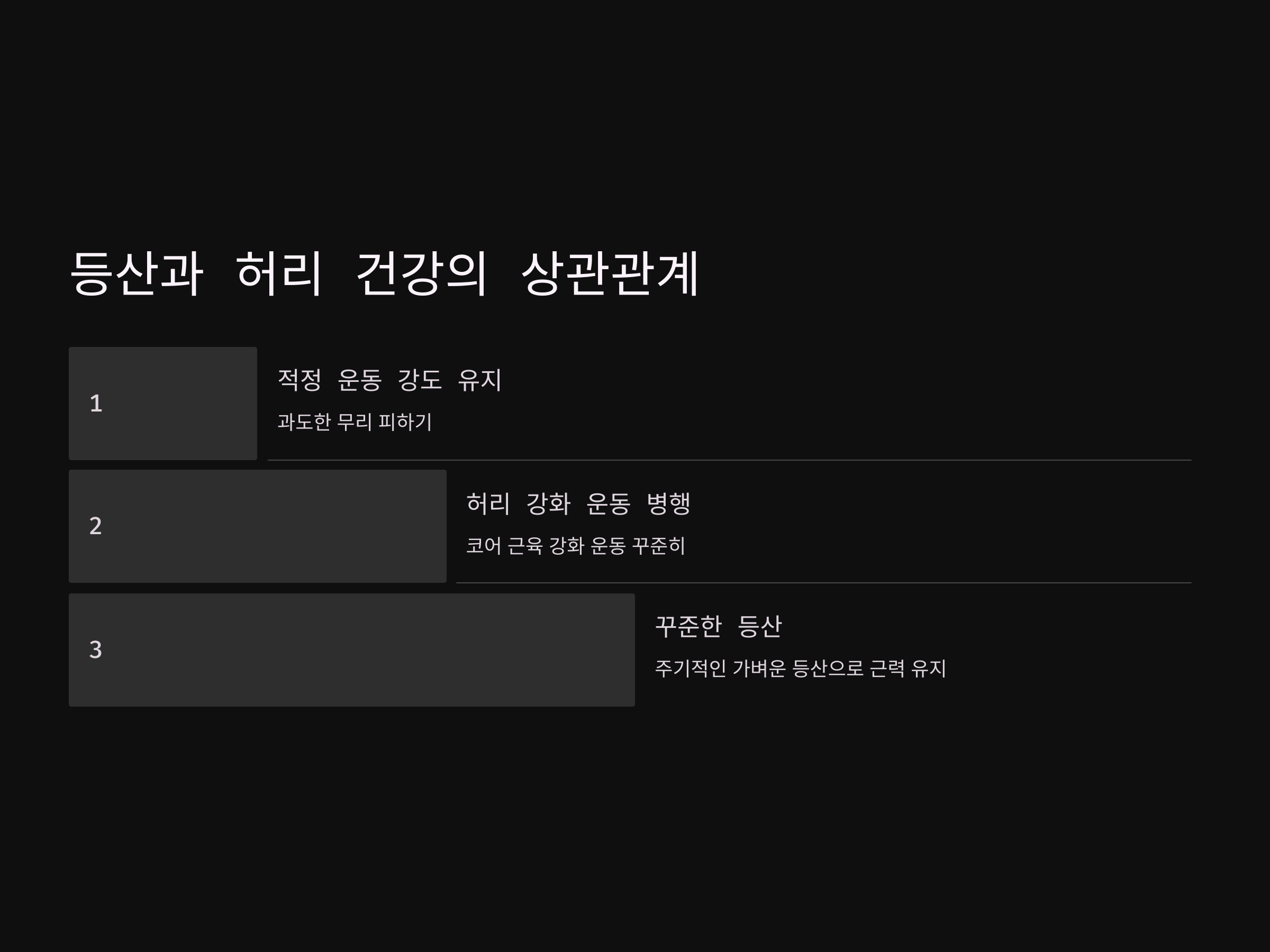 - 허리 강화 운동 병행: 등산 외에도 코어 근육을 강화하는 운동을 꾸준히 하면 허리 부담을 줄일 수 있습니다.