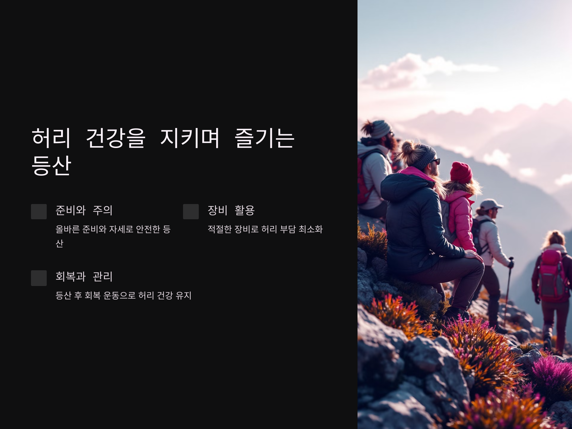 허리 통증 예방, 등산 준비 운동, 허리 보호 장비, 내리막길 걷기, 허리 건강 관리, 등산 코스 선택, 허리 스트레칭, 등산