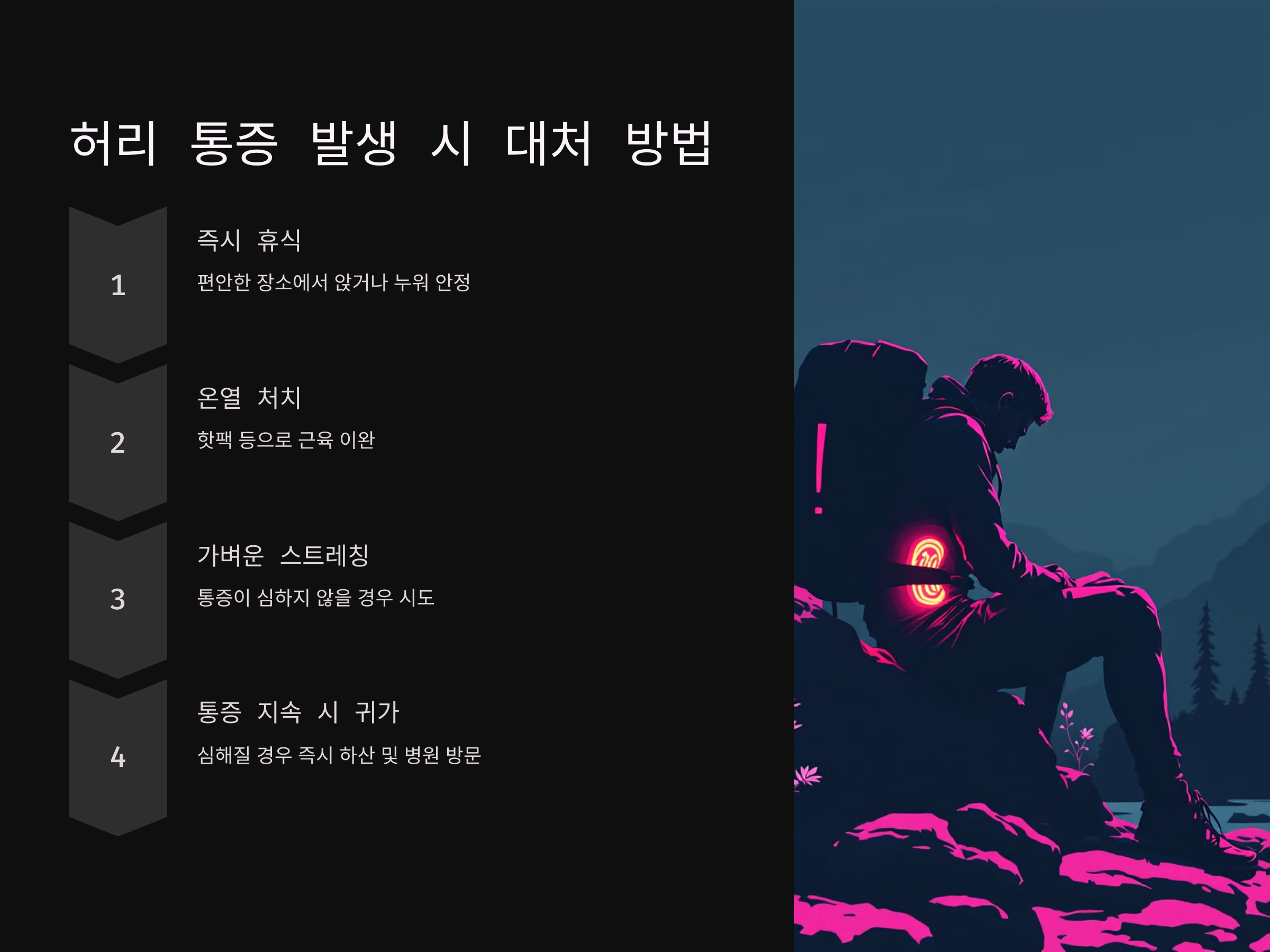 등산 중 허리 통증이 발생하면 즉시 대처해야 추가 부상을 예방할 수 있습니다.